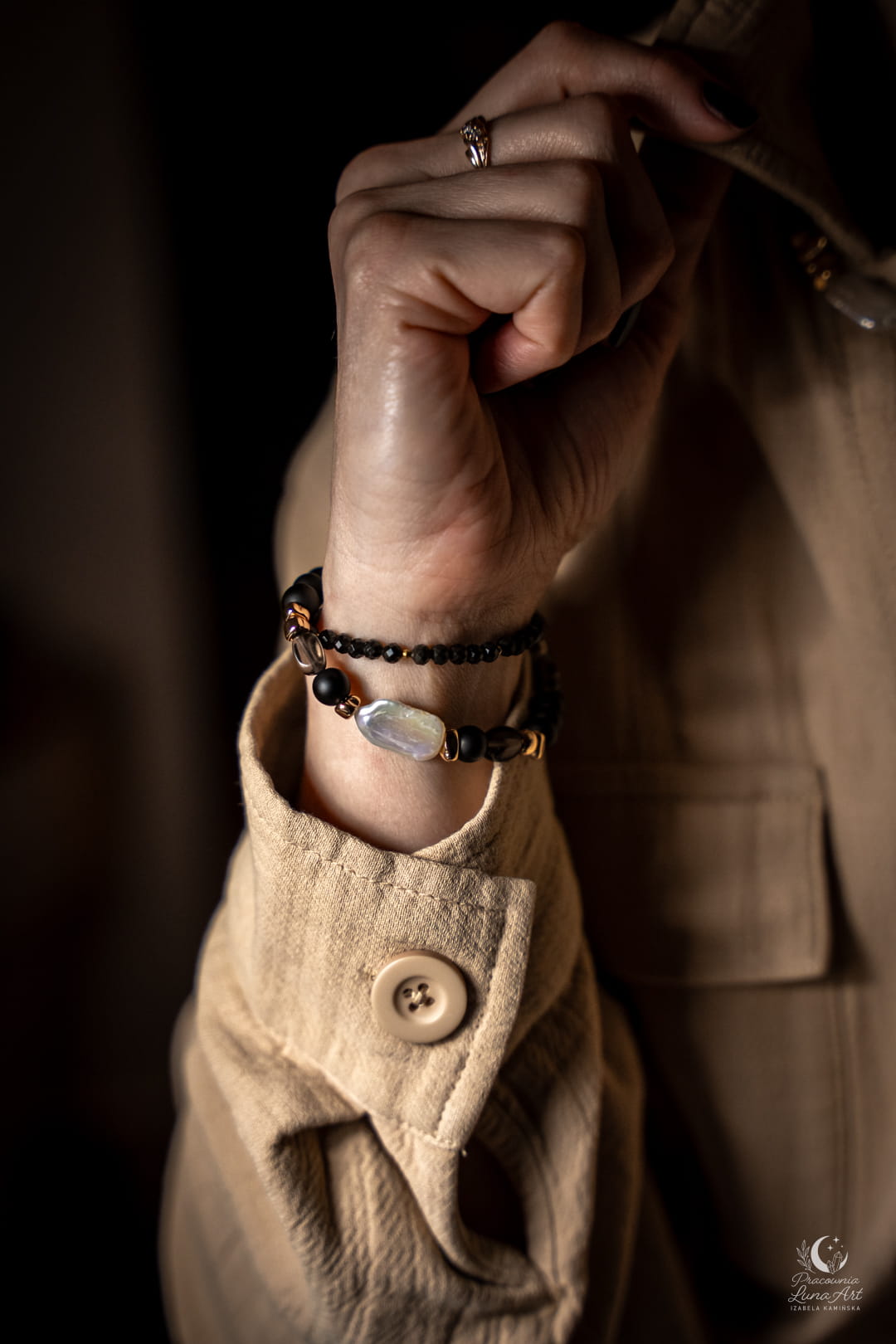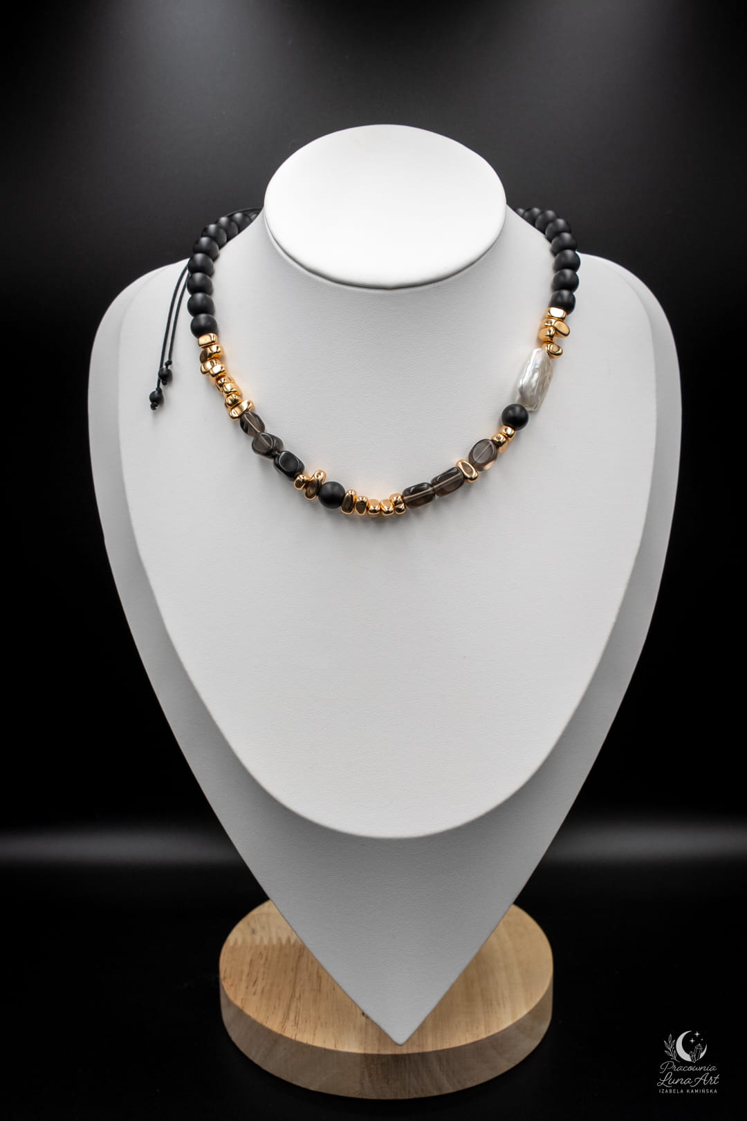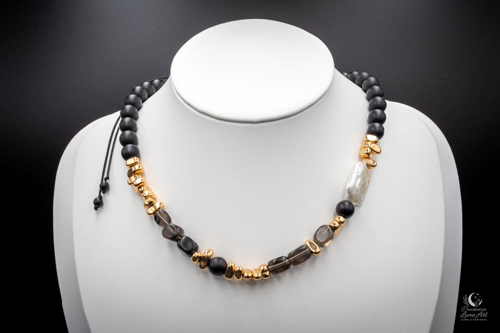 Poznaj biżuterię, która definiuje nowoczesną elegancję. Połączenie głębokiej, matowej czerni, dymnych transparentności i świetlistej perły tworzy projekt, obok którego nie da się przejść obojętnie. To pojedynczy egzemplarz unikatowy – zaprojektowany i wykonany tylko raz, by podkreślić Twoją niepowtarzalność.