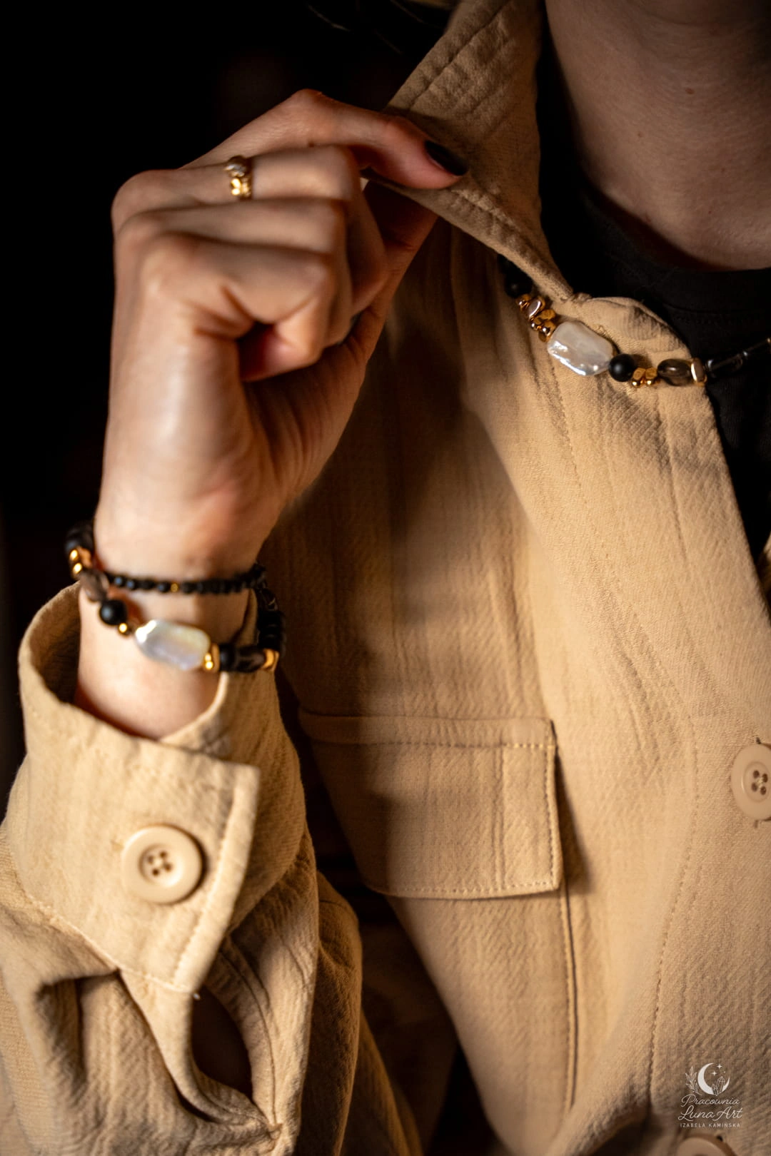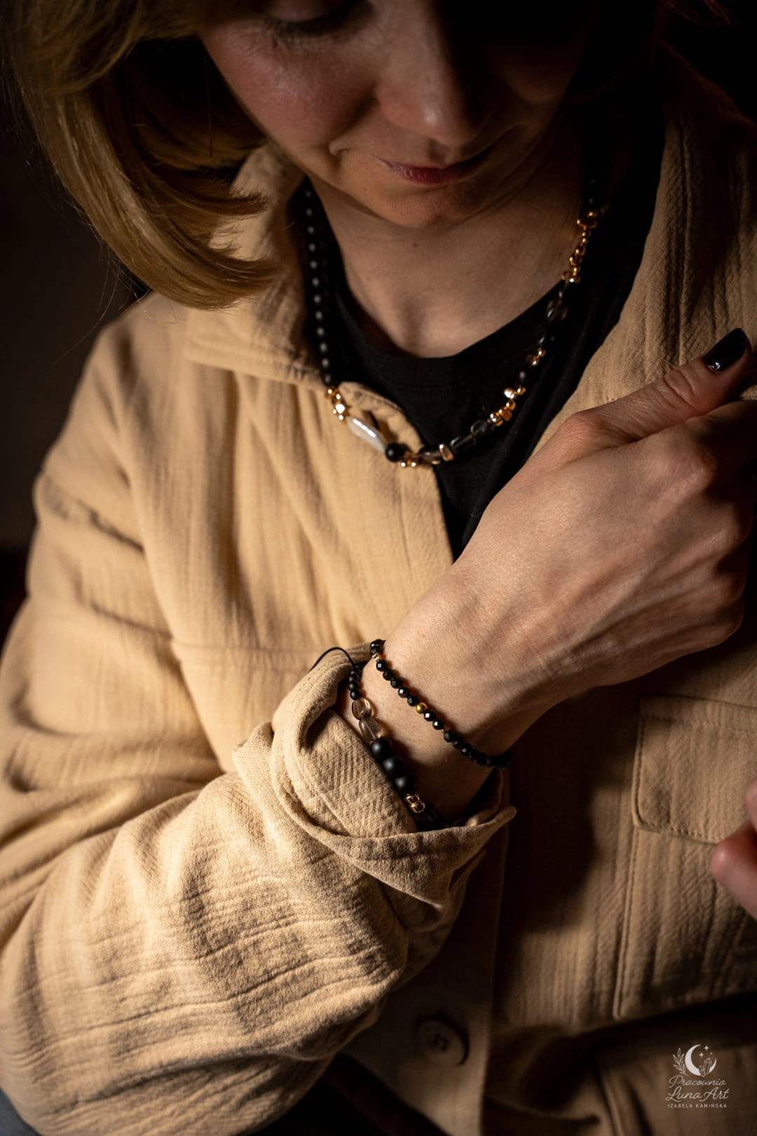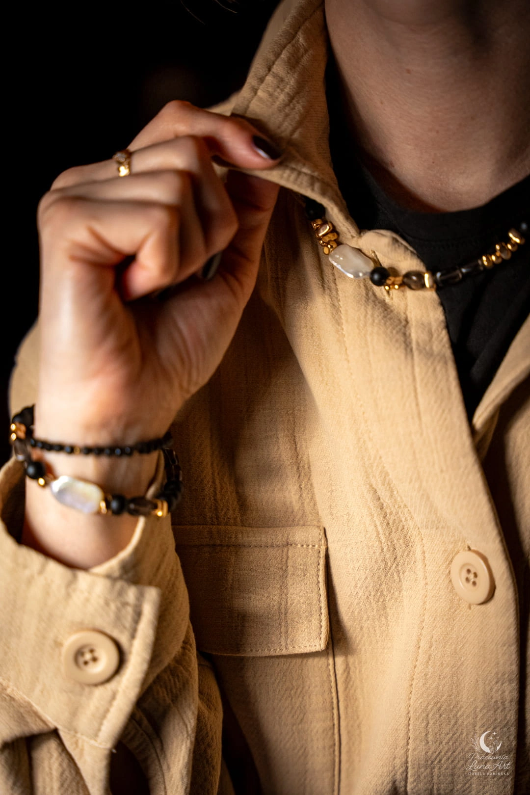 Bransoletka idealnie komponuje się zarówno z codziennym, lnianym lookiem, jak i wieczorową czernią. Możesz ją nosić solo lub w zestawie z innymi bransoletkami z kamieni, tworząc modne, warstwowe stylizacje.