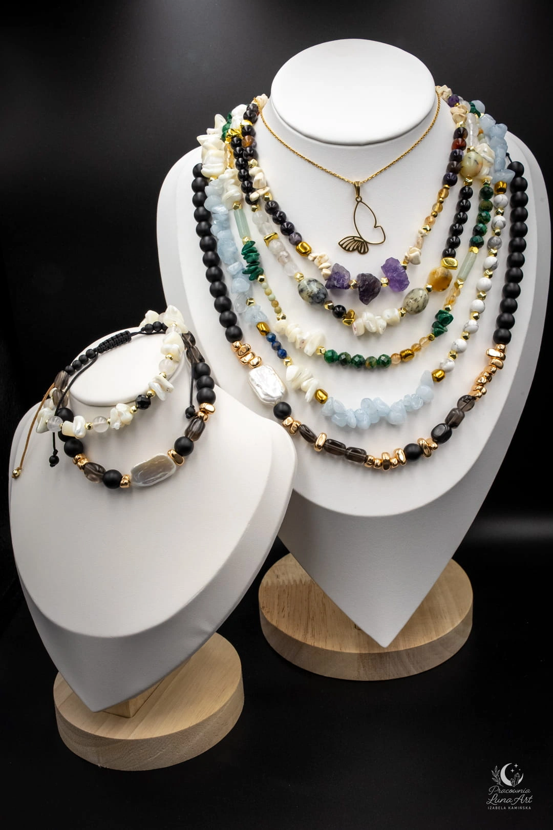 Ta biżuteria to kwintesencja elegancji w wydaniu "modern boho". Połączenie surowości matowych kamieni z lśniącym blaskiem masy perłowej tworzy kontrast, który przyciąga wzrok i nadaje stylizacji wyrafinowanego charakteru.