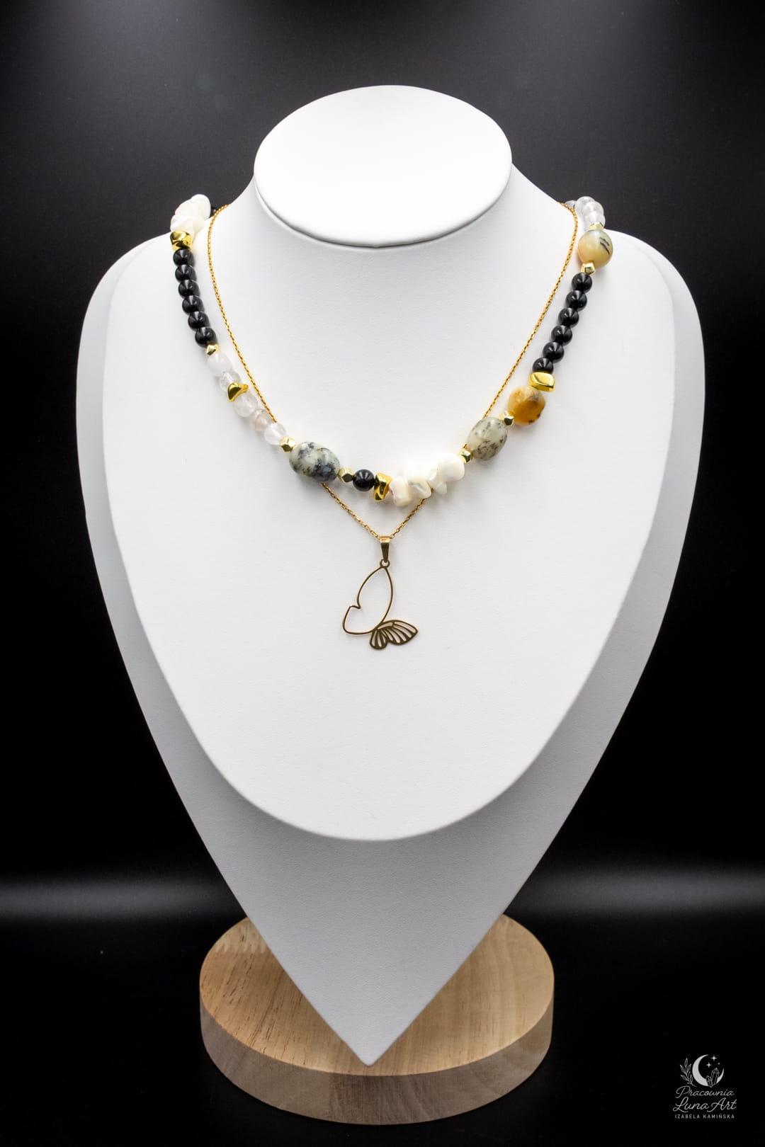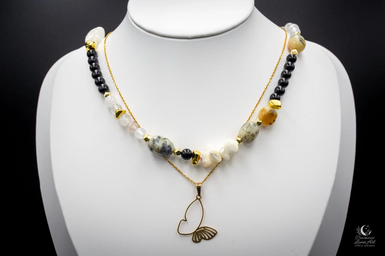 Uwaga: Przedmiotem sprzedaży jest unikatowy naszyjnik z kamieni naturalnych. Złoty naszyjnik z wisiorkiem motyla widoczny na zdjęciu stanowi inspirację stylizacyjną i nie jest częścią zestawu.