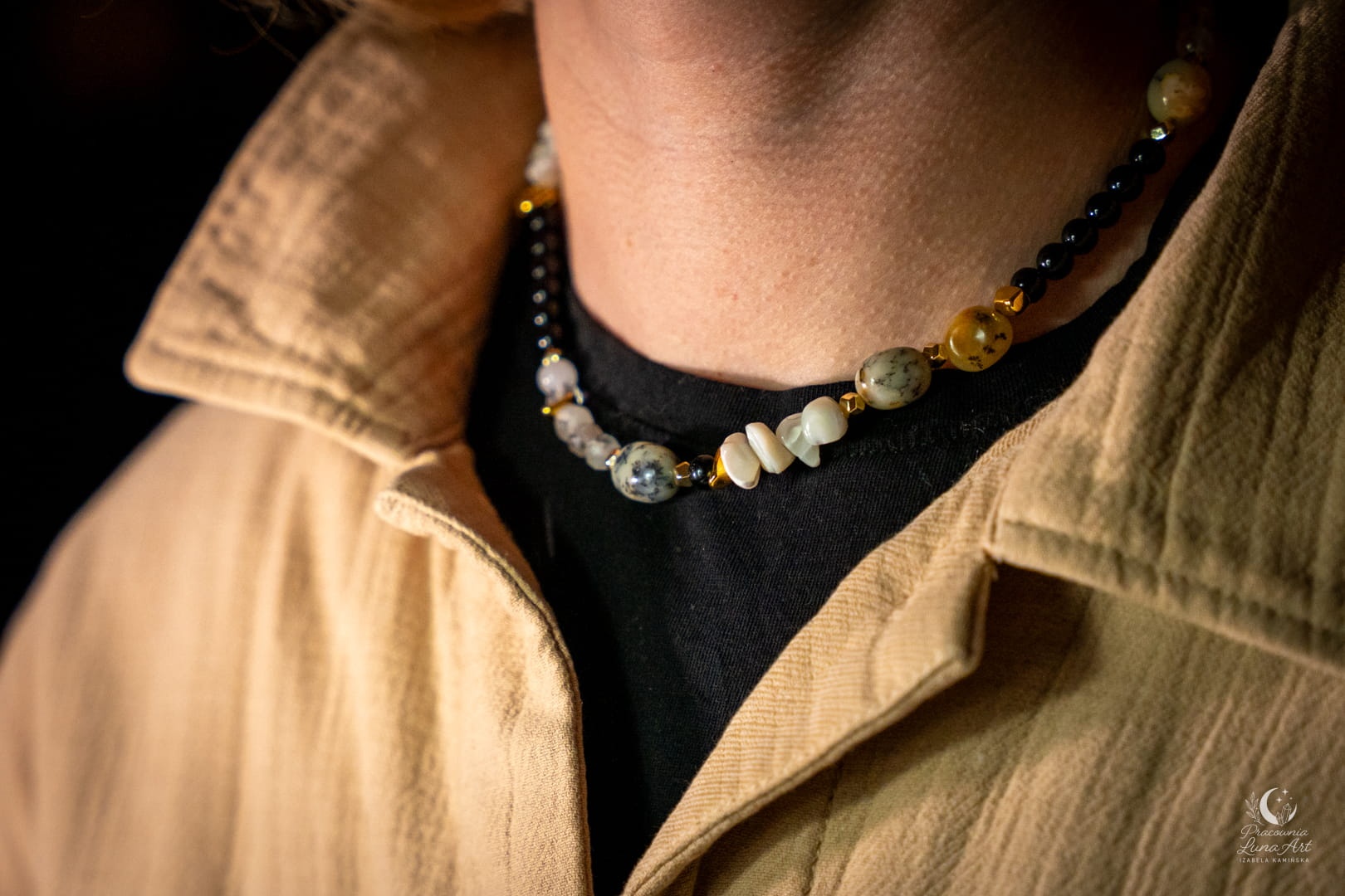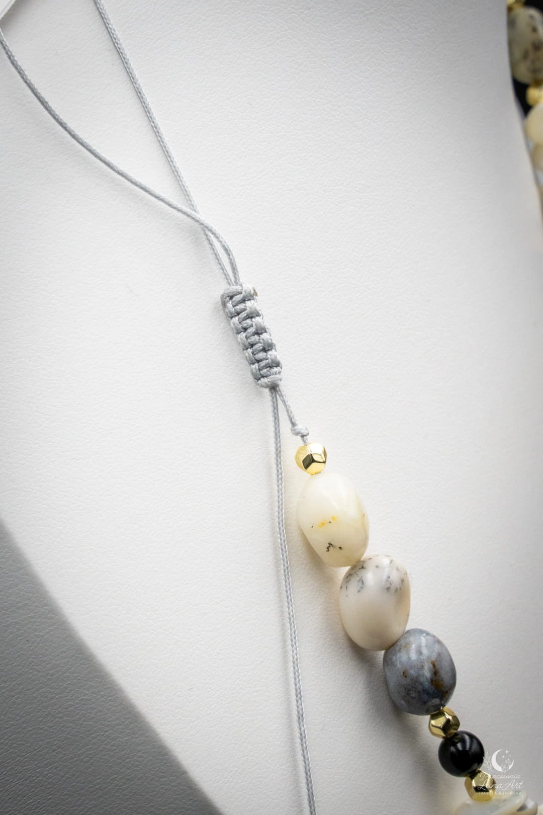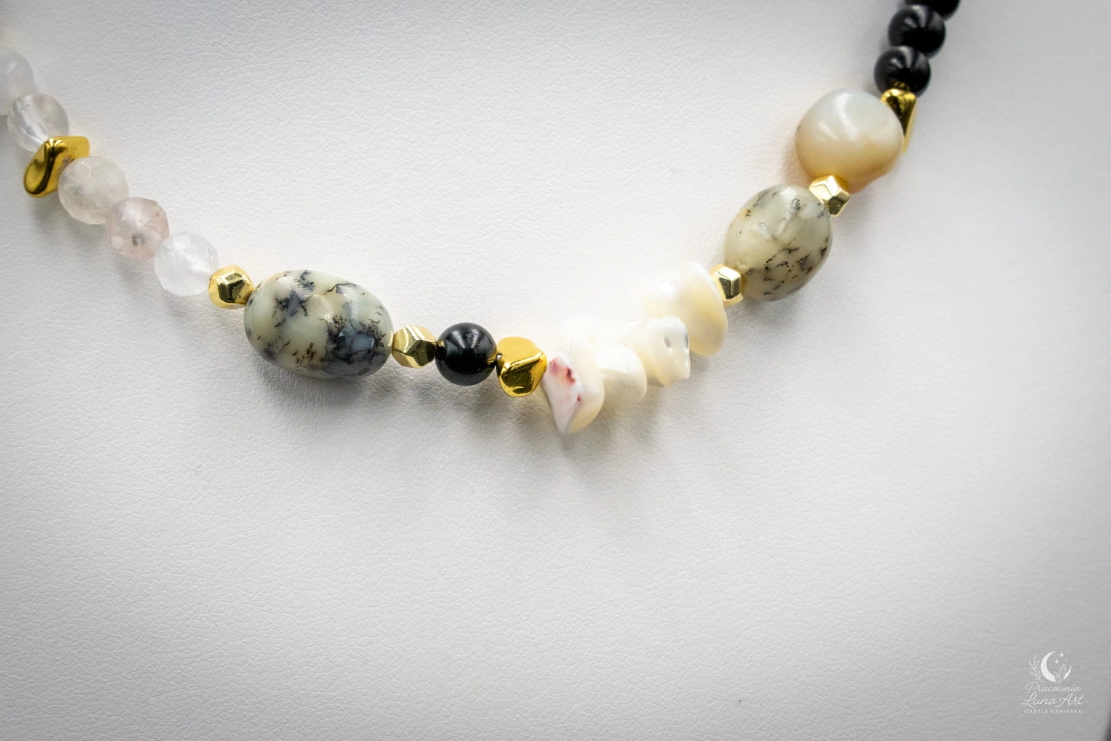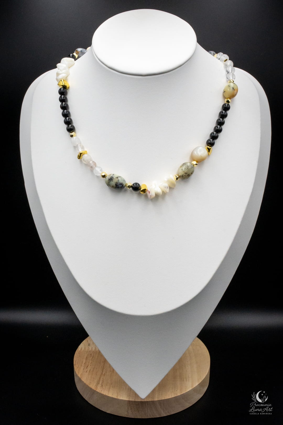 Ten naszyjnik to esencja elegancji spotykającej surową siłę ziemi. Połączenie głębokiej czerni turmalinu z mleczną bielą masy perłowej i świetlistością kryształu górskiego tworzy niezwykle szlachetny kontrast. Jest to pojedynczy, unikatowy egzemplarz, stworzony dla osób, które cenią biżuterię o silnym charakterze i niepowtarzalnym designie.