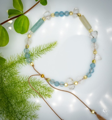 Bransoletka wykonana jest z naturalnych kamieni o średnicy od ok. 4 mm do 6 mm: kryształu górskiego, amazonitu, jadeitu oraz hematytu. Starannie dobrana kompozycja kolorów i faktur tworzy subtelny, a zarazem wyrazisty dodatek, który doskonale uzupełnia zarówno casualowe, jak i bardziej eleganckie stylizacje. Regulację zapewnia stoper ze srebra pozłacanego próby 925, który umożliwia idealne dopasowanie bransoletki do nadgarstka.