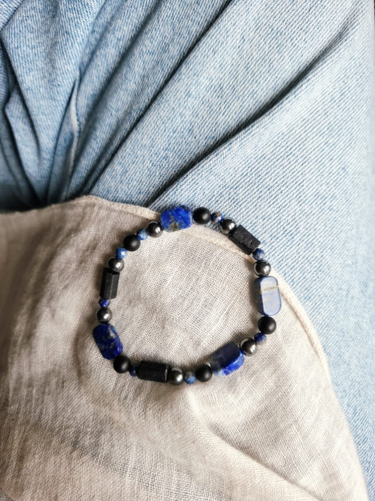 Bransoletka stworzona dla marzycielek, wizjonerek i kobiet, które chcą podkreślić swoją niezależność. Głęboki granat lapis lazuli z drobinkami pirytu (złote punkciki) w połączeniu z chłodnym hematytem sprawia, że biżuteria wygląda luksusowo i intrygująco.