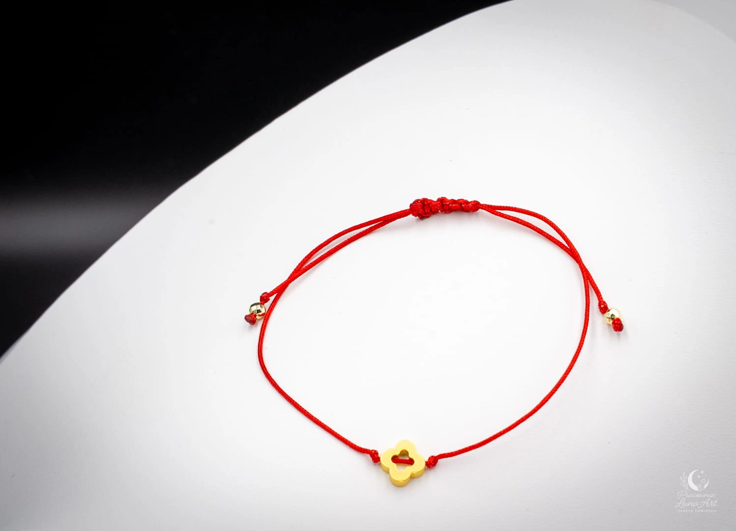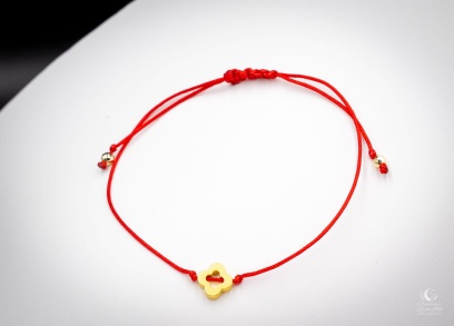 Na zdjęciu widoczna jest subtelna bransoletka na czerwonym sznurku, wykonana ręcznie w minimalistycznej formie. Centralnym elementem jest złoty hematytowy motyw w kształcie koniczynki, który nadaje biżuterii lekkości i symbolicznego charakteru. Całość dopełniają drobne elementy z hematytu umieszczone na zakończeniach sznurka.