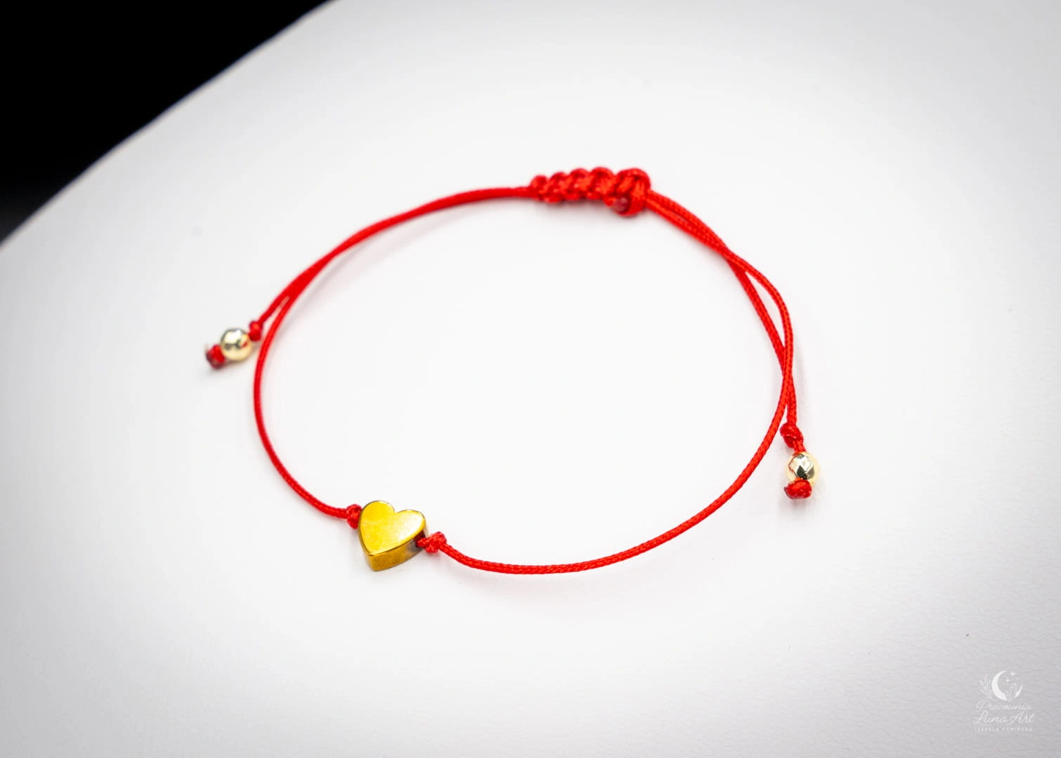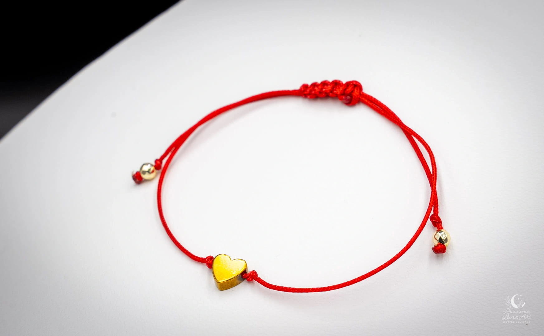 Centralnym elementem jest złote serce z hematytu o prostej, gładkiej formie, które symbolizuje miłość, bliskość i pozywną energię. Bransoletka posiada regulowane wiązanie makramowe, dzięki czemu można ją łatwo dopasować do nadgarstka.