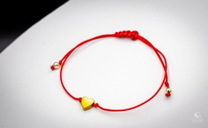 Czerwony sznurek, będący od wieków symbolem ochrony, siły i energii życiowej, nadaje biżuterii znaczenie talizmanu. Subtelne złote kuleczki z hematytu na zakończeniach sznurka dodają całości elegancji i delikatnego blasku.