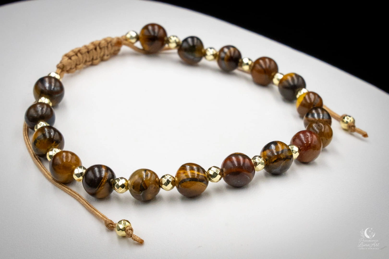 Kamień główny: Gładkie, polerowane kuleczki tygrysiego oka. Charakteryzują się one piękną, jedwabistą poświatą i "migotliwością" (efekt kociego oka) w odcieniach złocistego brązu, miodu i głębokiej czerni.