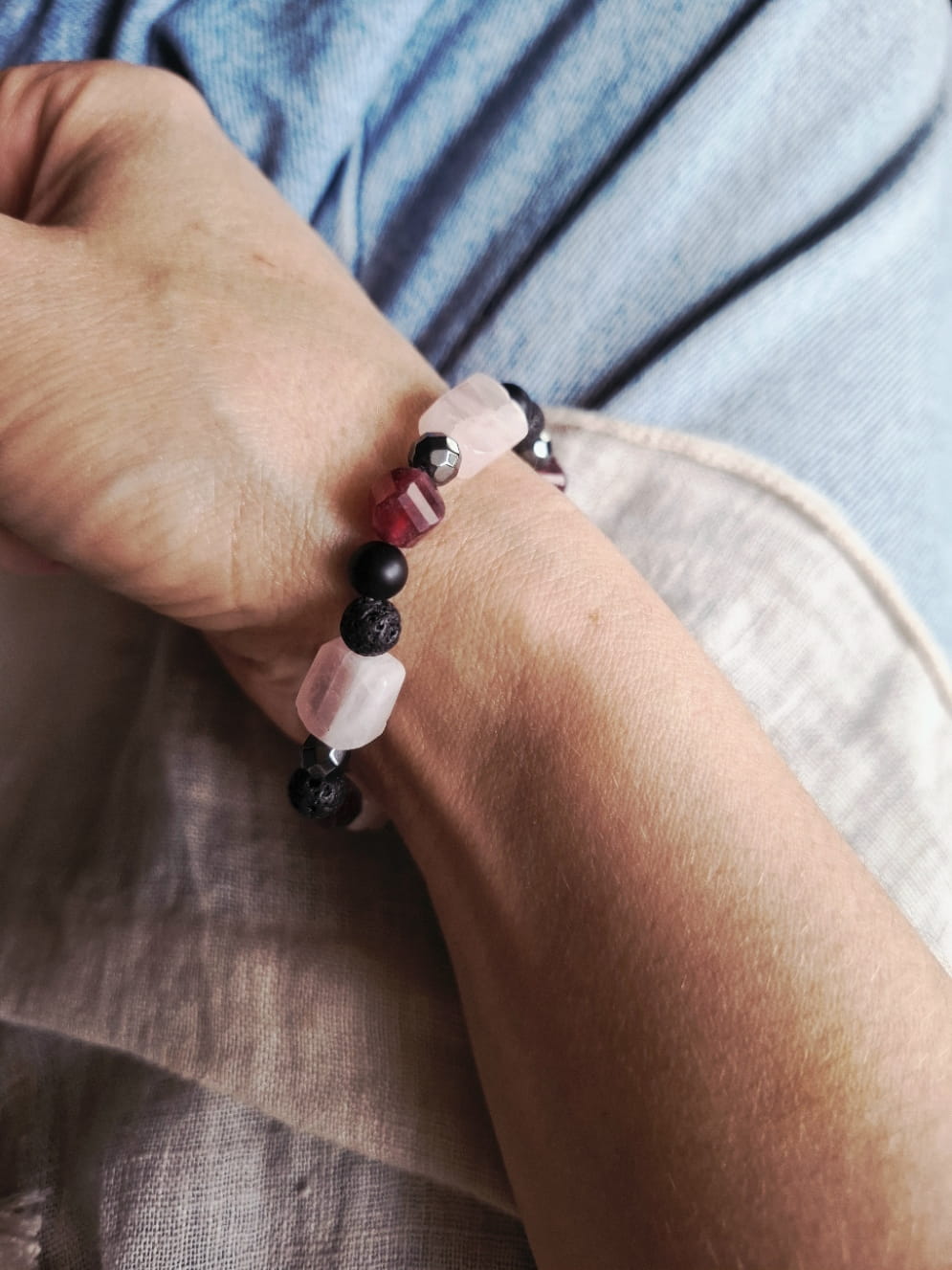 Idealna dla kobiet dynamicznych, które potrzebują dodatkowej dawki "paliwa" do działania. Ciemna kolorystyka przełamana krwistą czerwienią granatu i czystością kwarcu sprawia, że bransoletka wygląda bardzo elegancko, a zarazem drapieżnie.