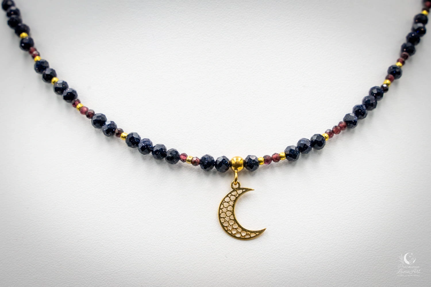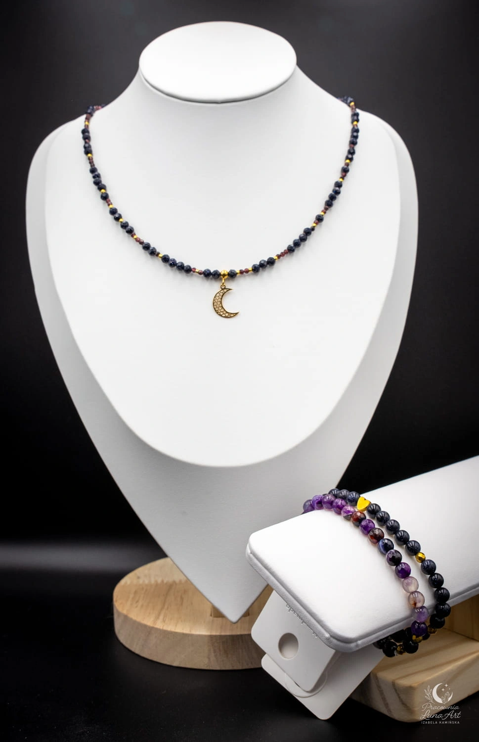 Kompozycję tworzą głębokie, granatowe kamienie Nocy Kairu, przełamane intensywną czerwienią granatu oraz metalicznym połyskiem hematytu.