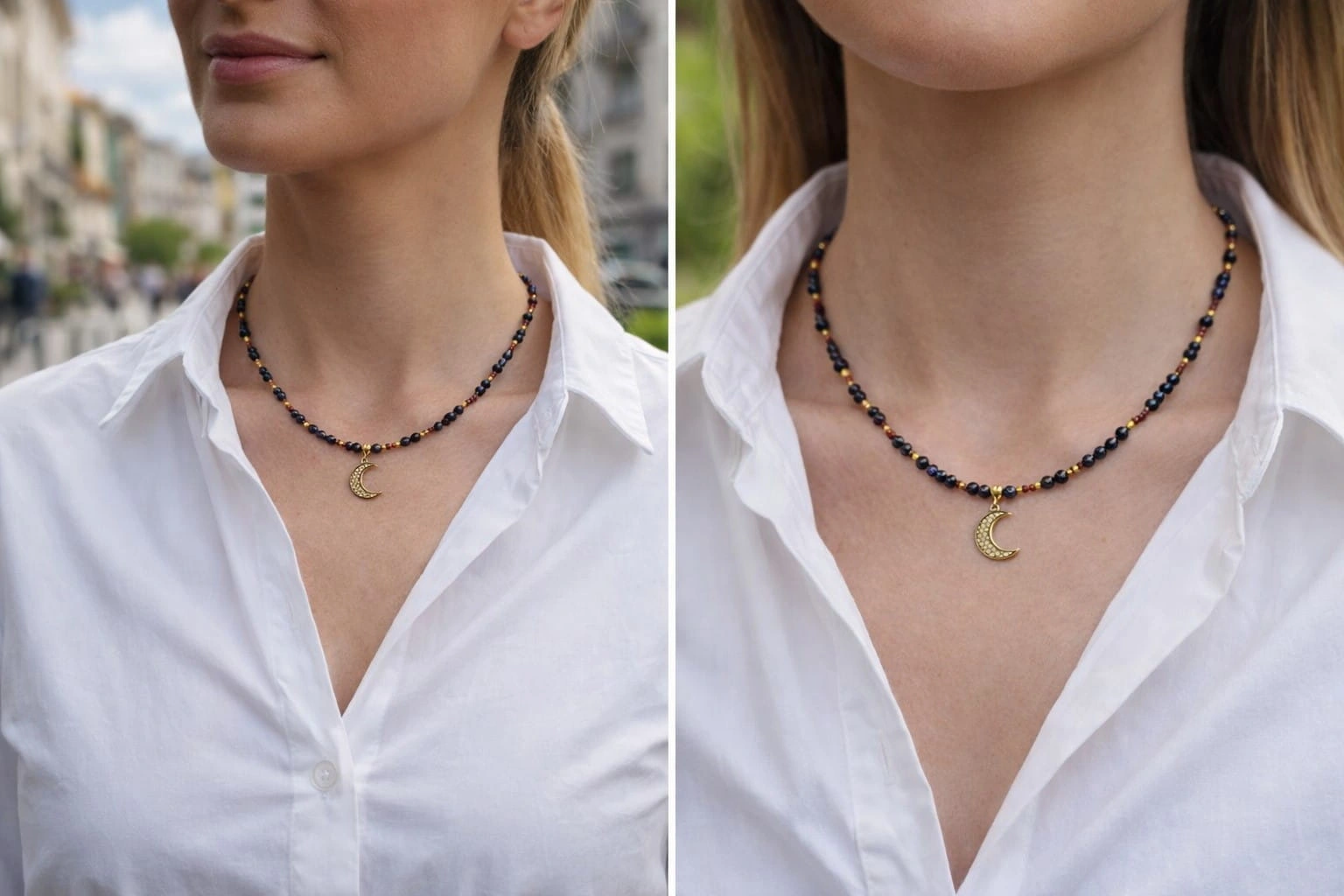 Zestawienie tych barw daje efekt subtelnego blasku i szlachetnej głębi, który pięknie podkreśla dekolt – zarówno na co dzień, jak i przy bardziej eleganckich stylizacjach.