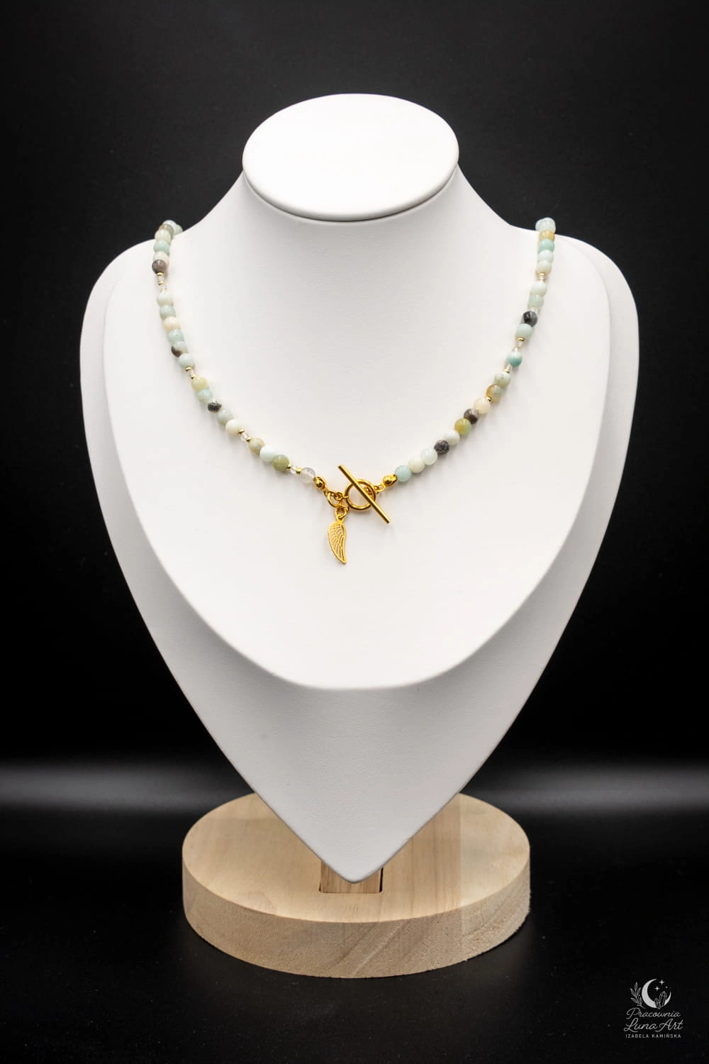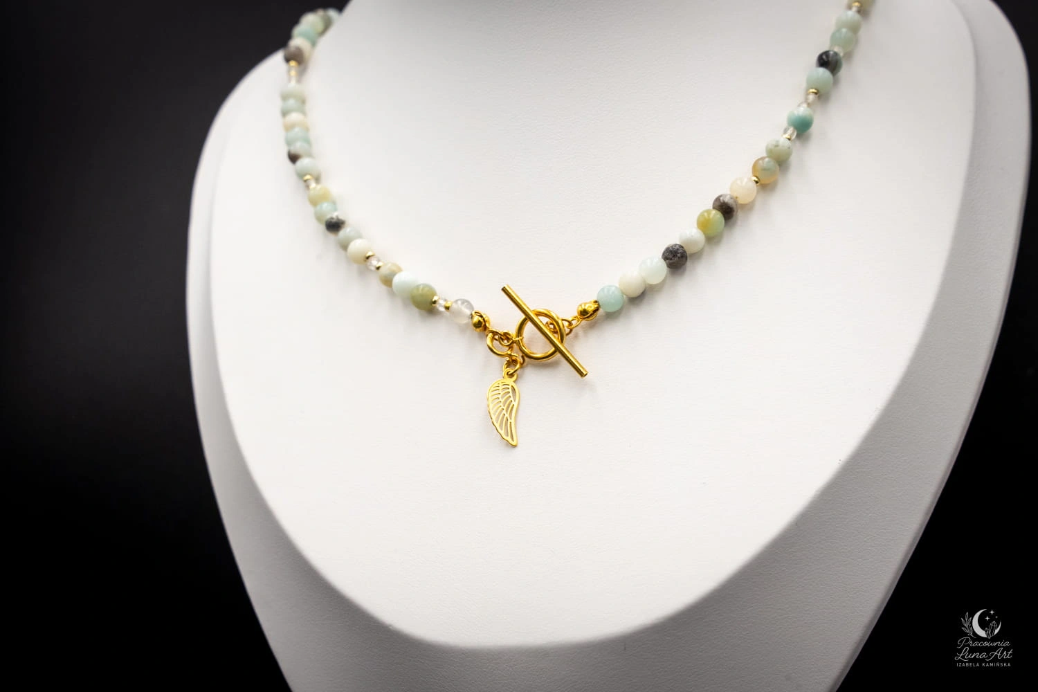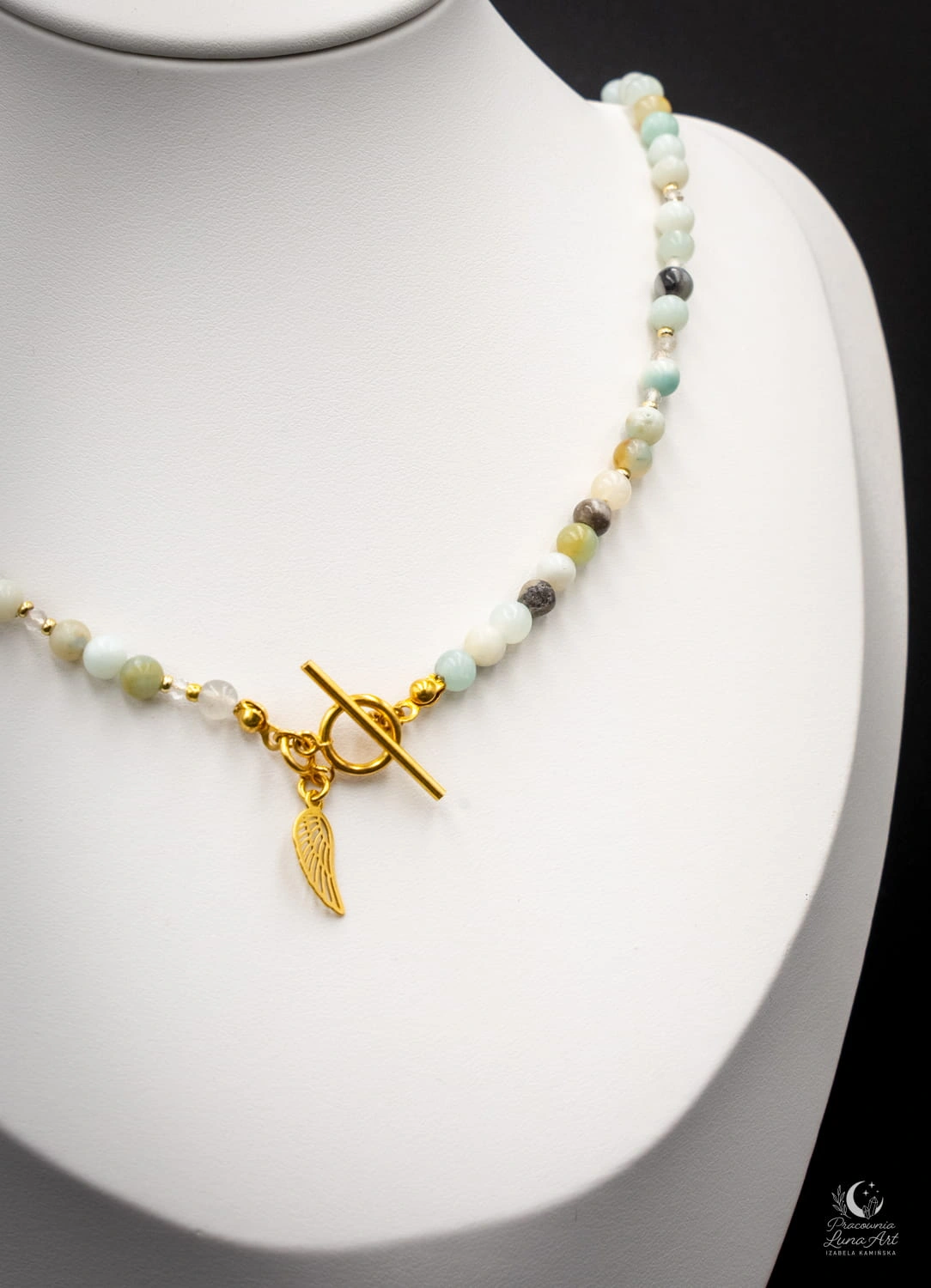 Wyjątkowy naszyjnik wykonany z naturalnych kamieni: amazonitu, kryształu górskiego oraz hematytu, tworzących lekką, a jednocześnie wyrazistą kompozycję. Delikatne, świeże odcienie amazonitu pięknie współgrają z czystością kryształu górskiego i subtelnym, metalicznym połyskiem hematytu. Całość zachwyca elegancją i harmonią form. Naszyjnik posiada ozdobne zapięcie typu toggle, które stanowi integralny element designu. Uzupełnieniem kompozycji jest symboliczna zawieszka w kształcie skrzydła, dodająca biżuterii lekkości i znaczenia. Zapięcie oraz zawieszka wykonane są ze srebra próby 925 pozłacanego.