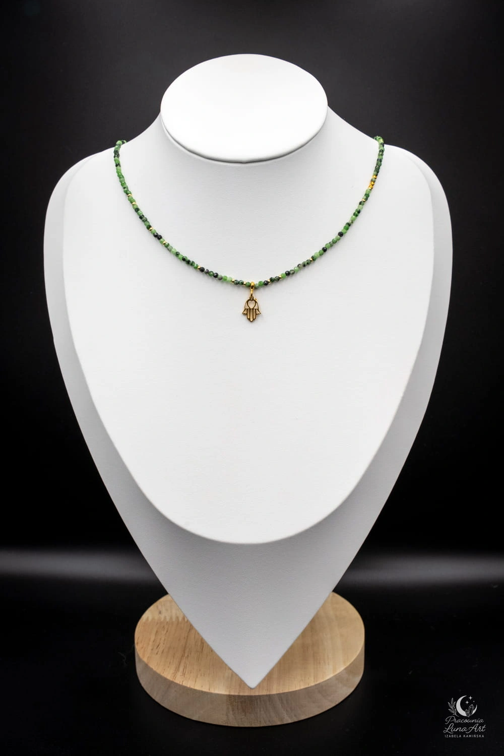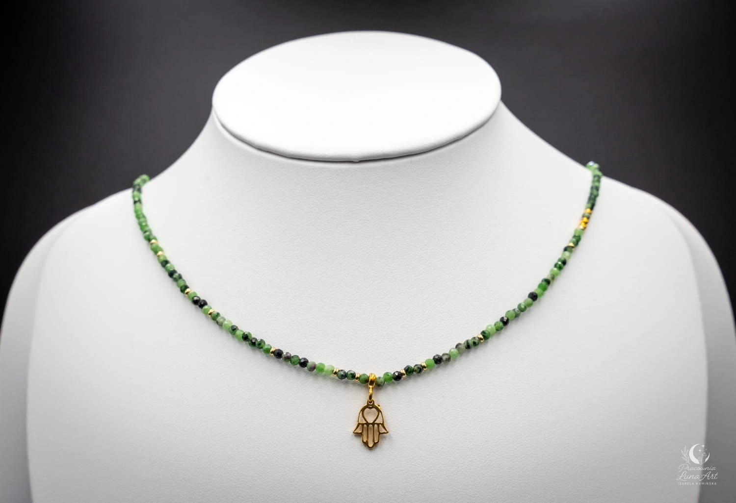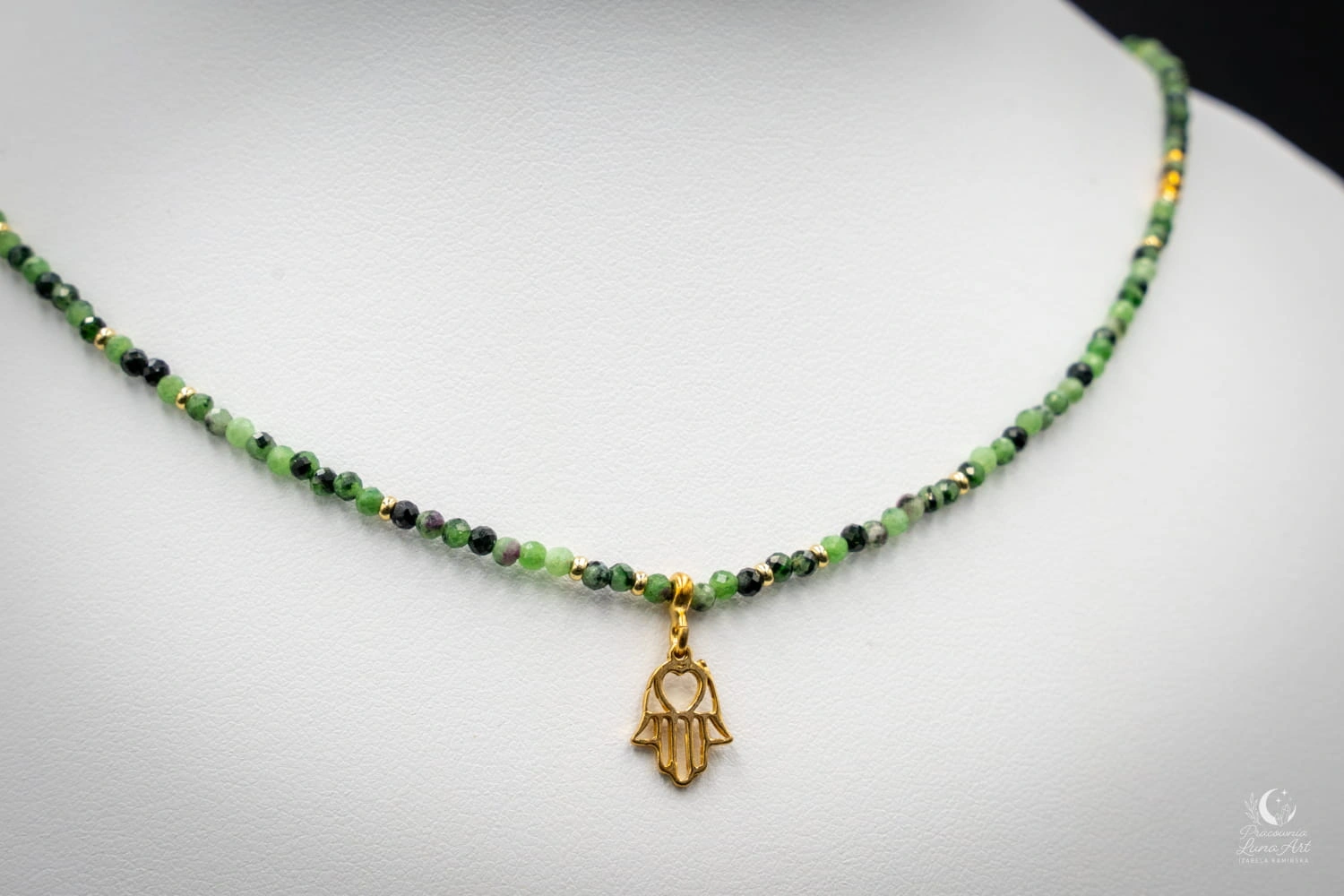 Subtelny i elegancki naszyjnik wykonany z naturalnych kamieni zoisytu z rubinem i hematytem łączący harmonię z wyrazistą energią. Zielone odcienie zoisytu przeplatają się z głęboką czerwienią rubinu, tworząc niepowtarzalną, naturalną kompozycję o spokojnym, a jednocześnie szlachetnym charakterze. Zoisyt symbolizuje równowagę i wewnętrzny spokój, natomiast rubin kojarzony jest z siłą życiową, odwagą i energią działania. Naszyjnik zapinany jest na klasyczne zapięcie typu federing, które zapewnia wygodę i bezpieczeństwo noszenia. Zawieszka w kształcie ręki Fatimy oraz elementy zapięcia wykonane ze srebra pozłacanego p.925.
