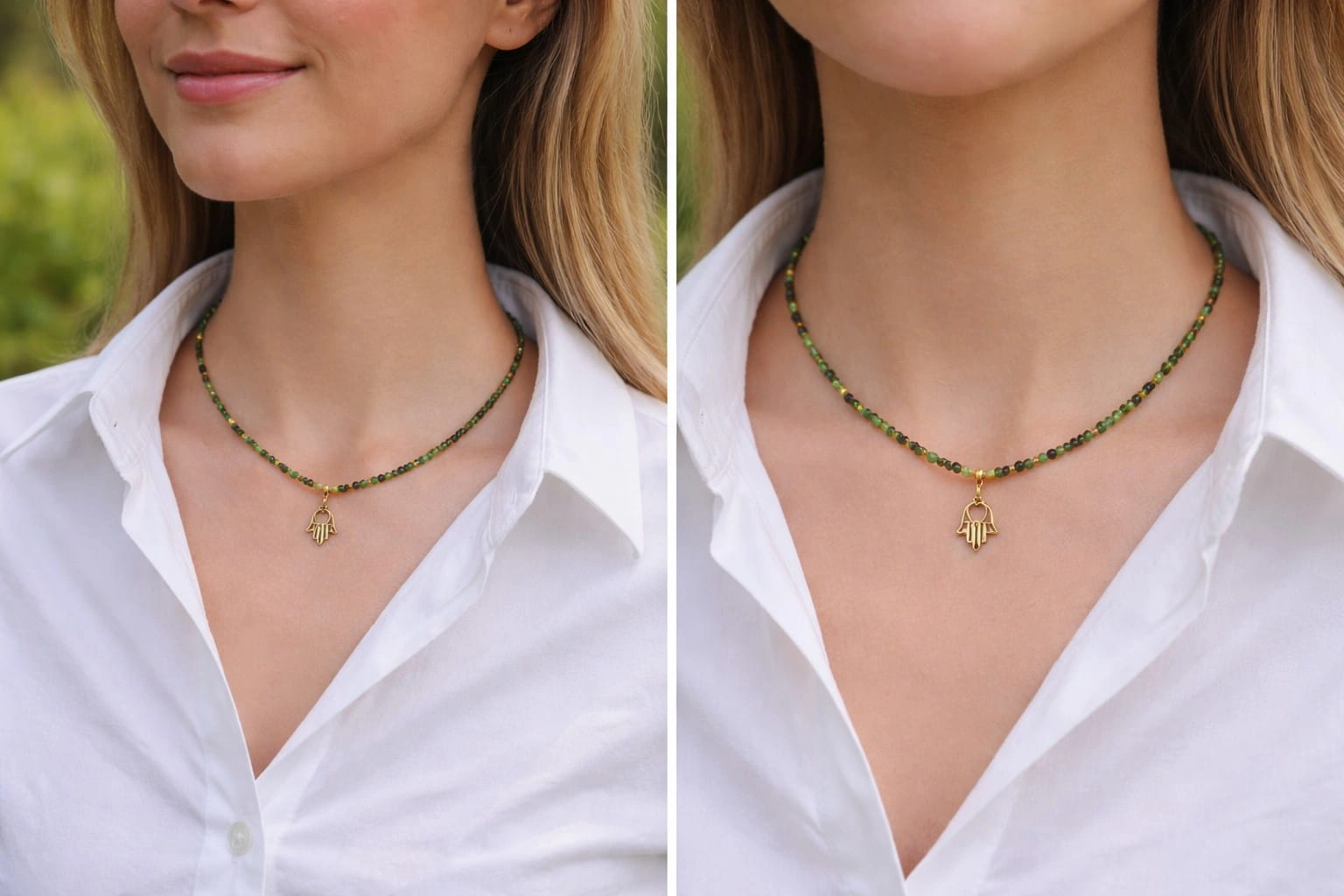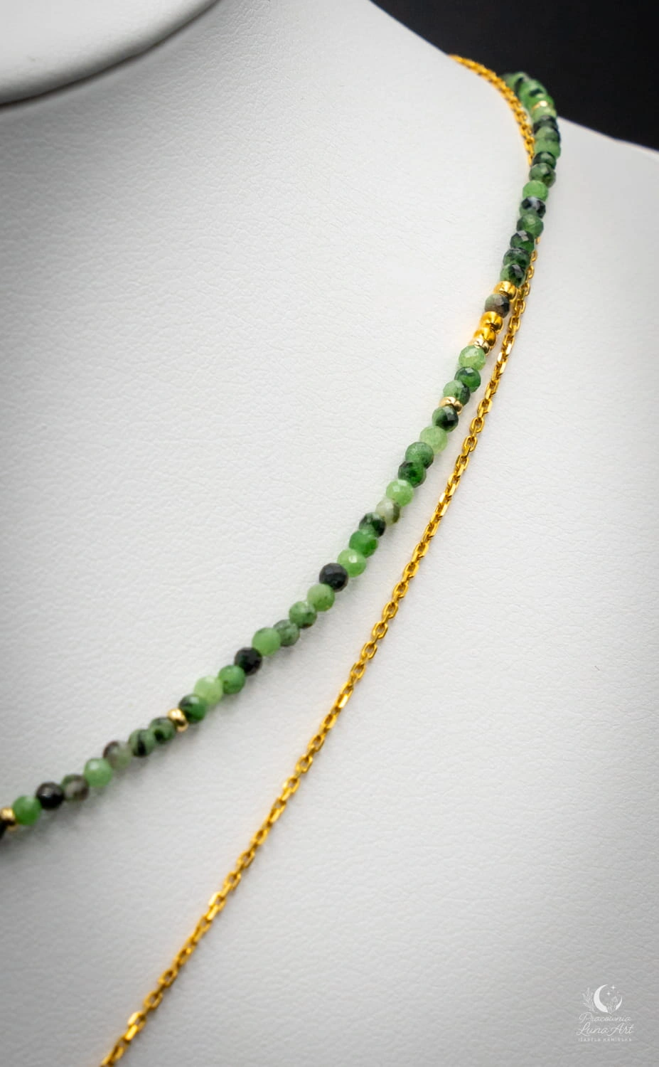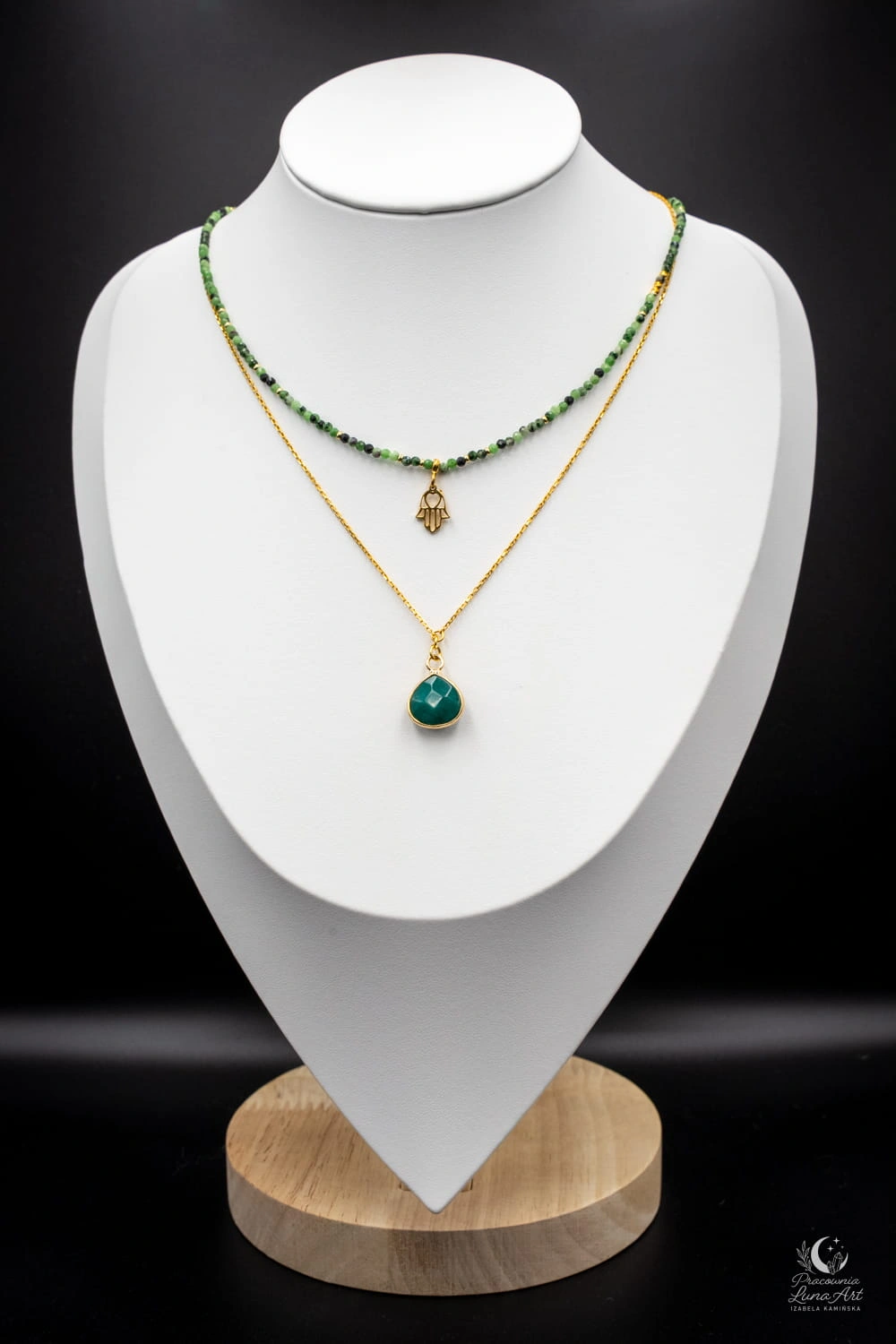 Subtelny i elegancki naszyjnik wykonany z naturalnych kamieni zoisytu z rubinem i hematytem łączący harmonię z wyrazistą energią. Zielone odcienie zoisytu przeplatają się z głęboką czerwienią rubinu, tworząc niepowtarzalną, naturalną kompozycję o spokojnym, a jednocześnie szlachetnym charakterze. Zoisyt symbolizuje równowagę i wewnętrzny spokój, natomiast rubin kojarzony jest z siłą życiową, odwagą i energią działania. Naszyjnik zapinany jest na klasyczne zapięcie typu federing, które zapewnia wygodę i bezpieczeństwo noszenia. Zawieszka w kształcie ręki Fatimy oraz elementy zapięcia wykonane ze srebra pozłacanego p.925.
