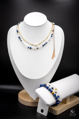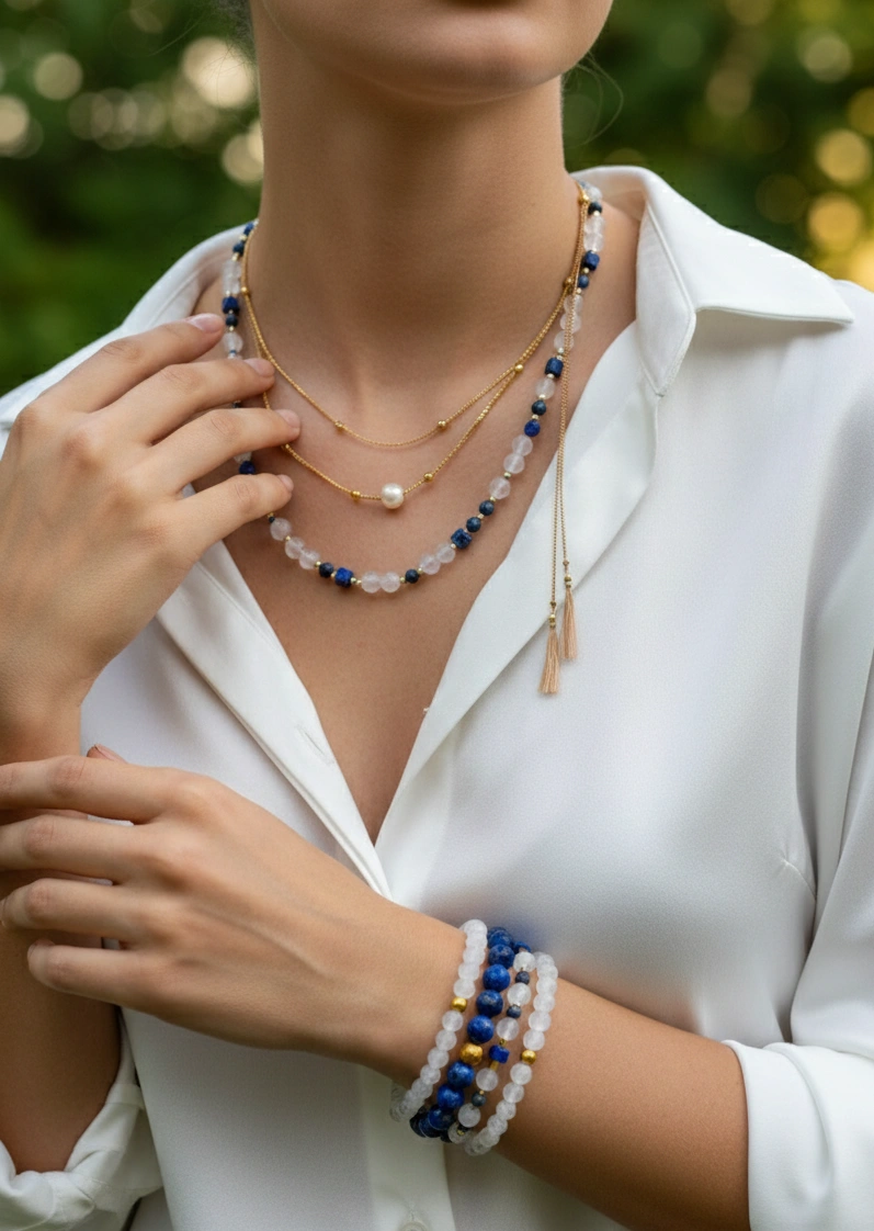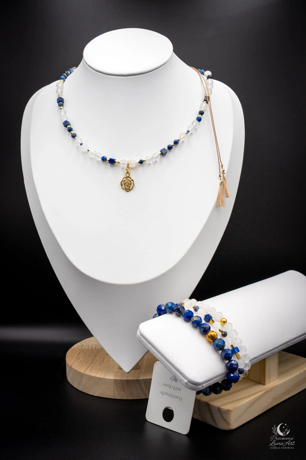 Elegancki, ręcznie wykonany naszyjnik będący harmonijnym połączeniem głębokiego, królewskiego błękitu lapis lazuli z przejrzystą czystością kryształu górskiego. Wyraziste, fasetowane kamienie przeplatają się, tworząc kompozycję pełną klasy i ponadczasowego stylu. Naszyjnik został zaprojektowany, by podkreślać pewność siebie i dodawać blasku zarówno codziennym, jak i wyjątkowym stylizacjom. Największe kamienie ok 6mm. Naszyjnik z zawieszką kwiata wykonaną ze srebra pozłacanego p.925, która jest odpinana.
