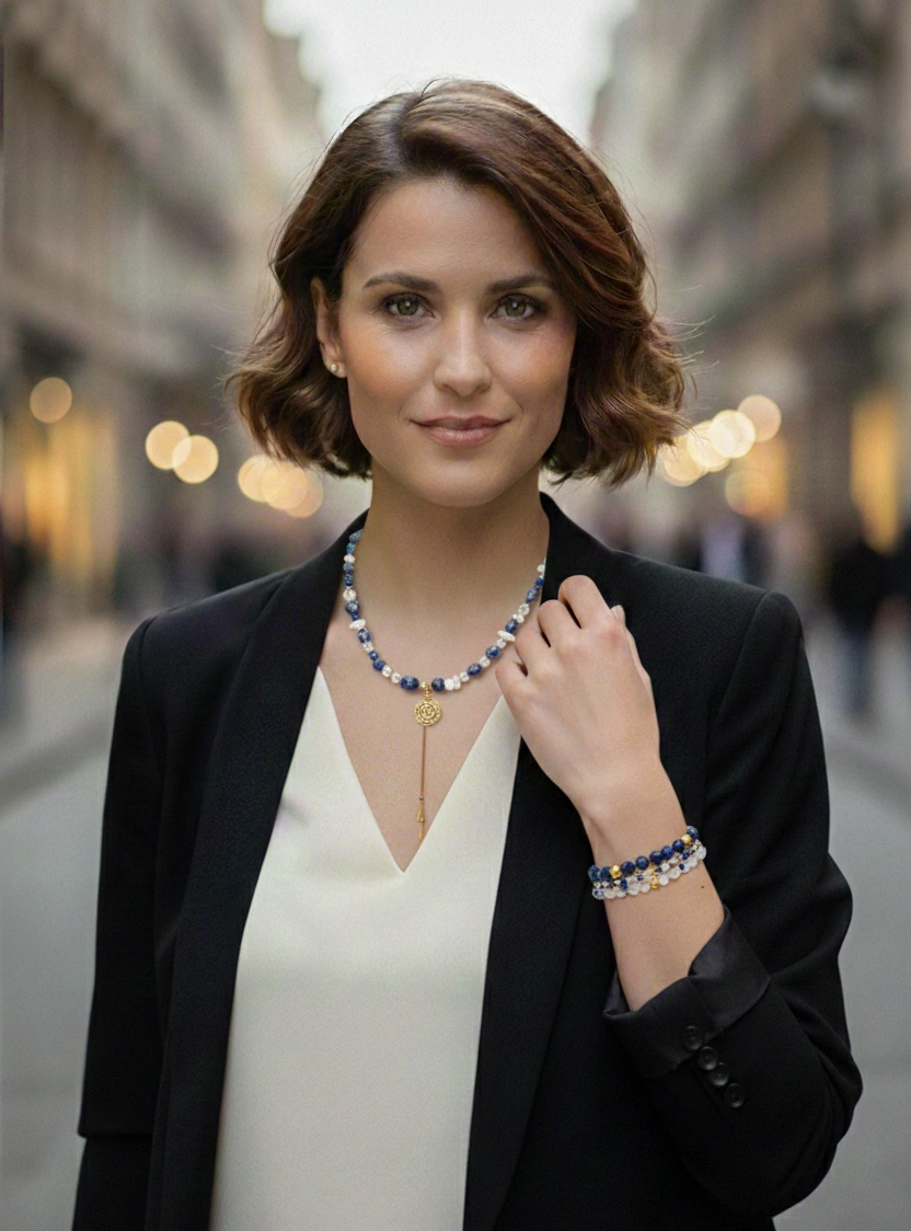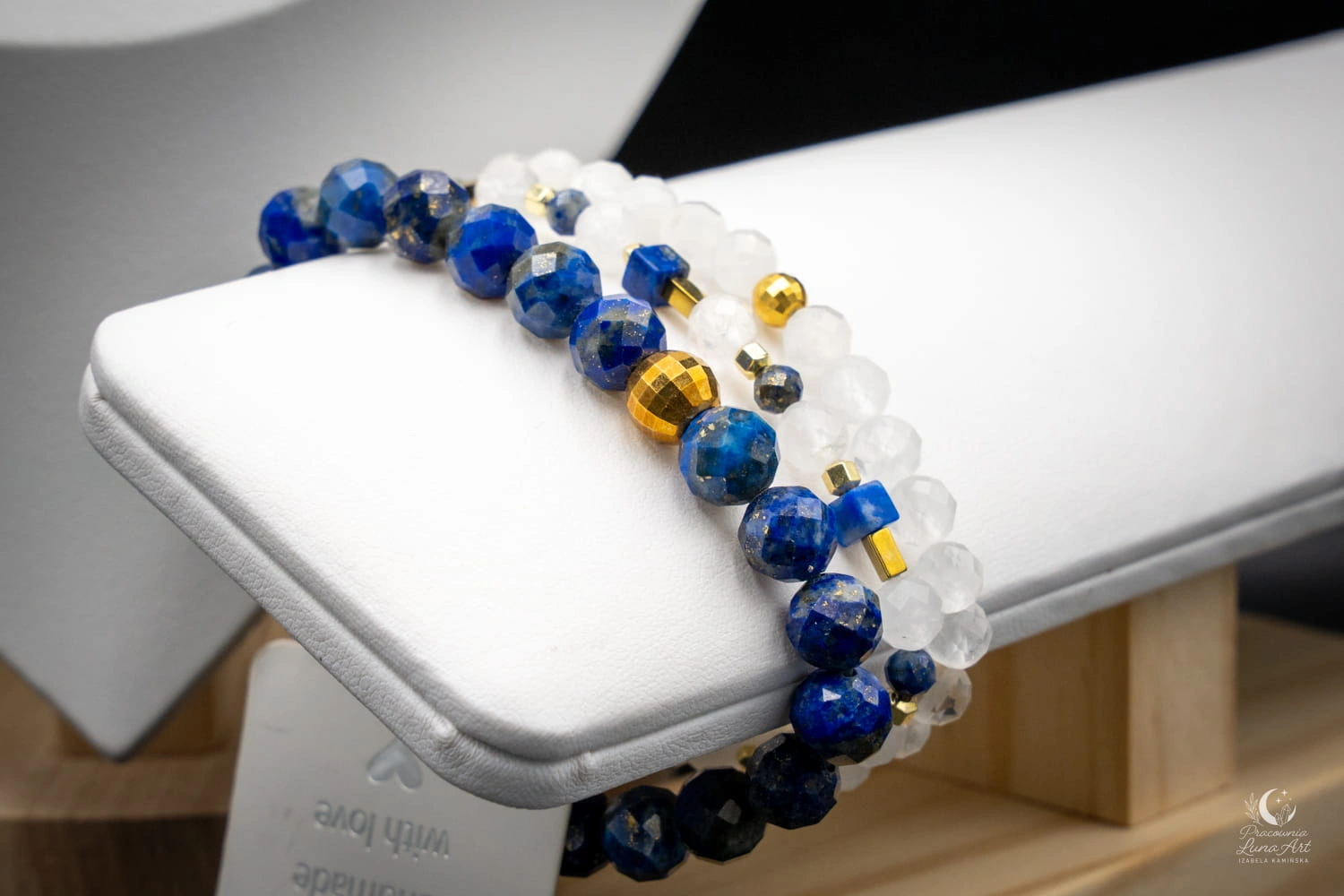 To połączenie minerałów sprzyja rozwojowi wewnętrznej mądrości i spokoju. Lapis Lazuli jest kamieniem prawdy i duchowej wiedzy, który wzmacnia intuicję oraz zdolność wyrażania własnych myśli. Kryształ górski działa jak potężny emiter energii – oczyszcza umysł, wprowadza klarowność i wzmacnia działanie lapis lazuli. Razem tworzą duet, który wspiera w dążeniu do autentyczności i wewnętrznej harmonii.