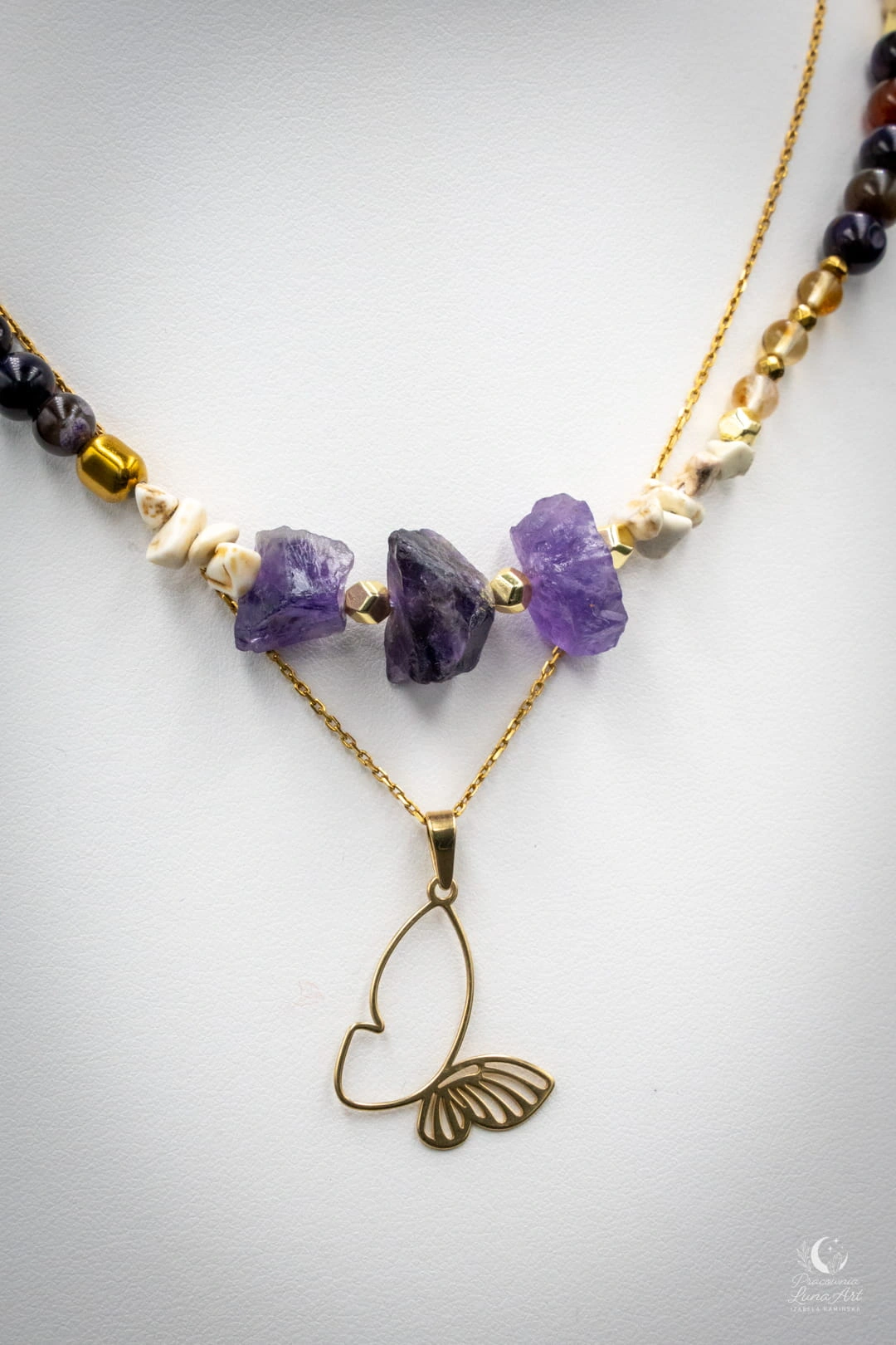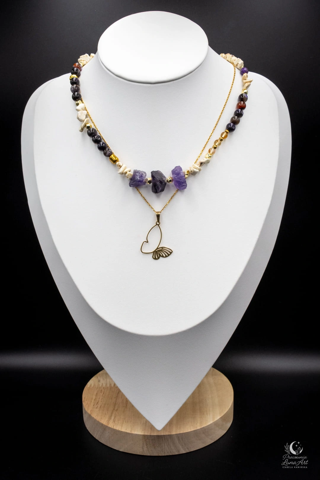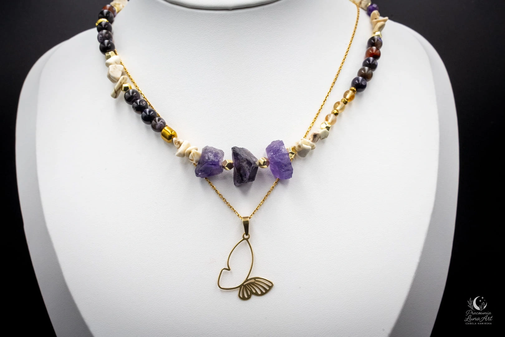 Uwaga: Przedmiotem sprzedaży jest unikatowy naszyjnik z kamieni naturalnych. Złoty naszyjnik z wisiorkiem motyla widoczny na zdjęciu stanowi inspirację stylizacyjną i nie jest częścią zestawu.