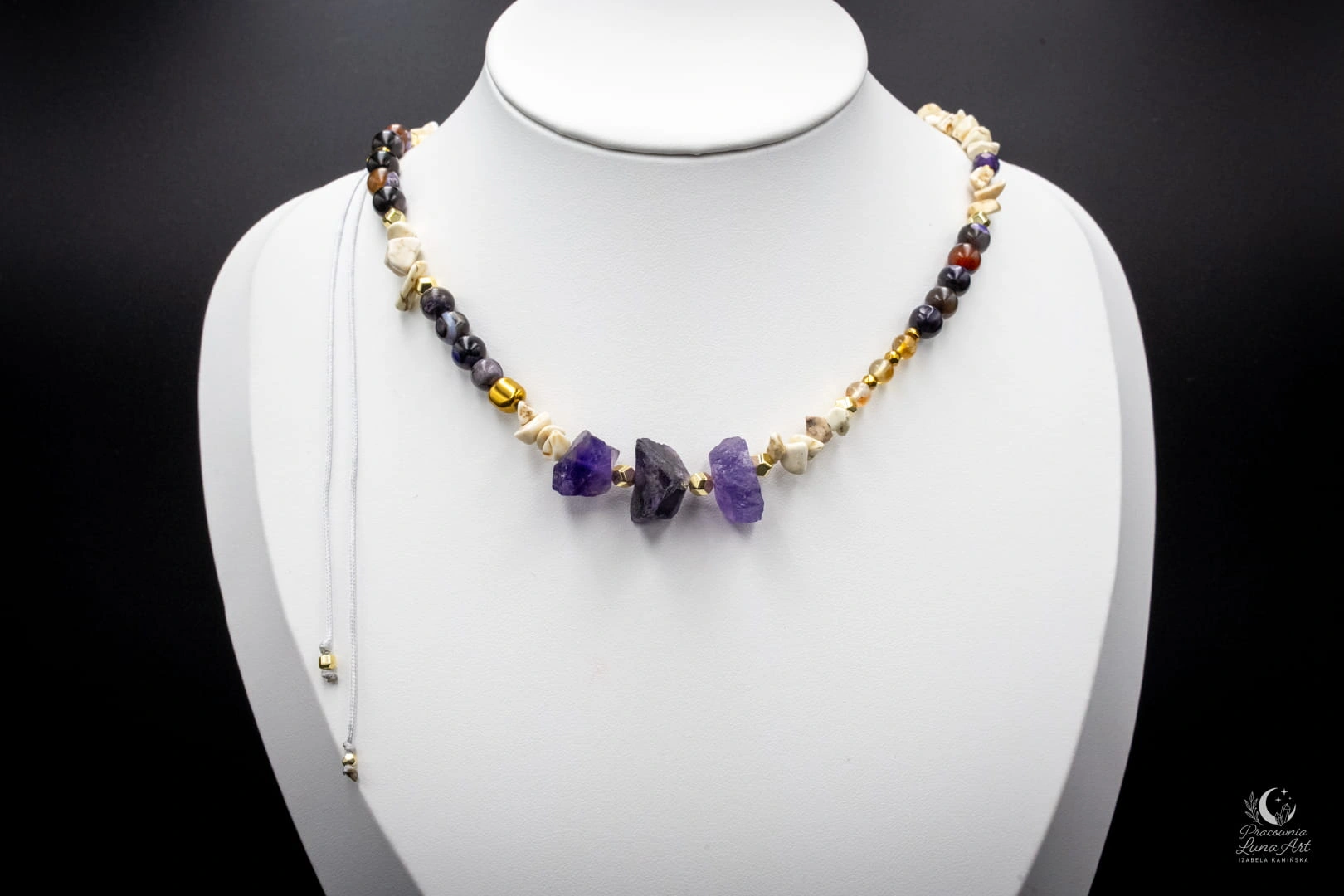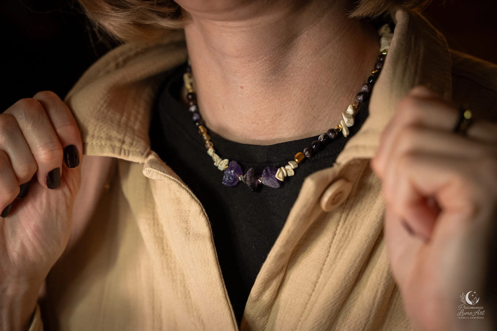 Poczuj magię naturalnych minerałów w ich najbardziej surowej i pięknej formie. Ten naszyjnik to połączenie głębokiego fioletu, ziemistych odcieni agatu i czystości howlitu. Jest to biżuteria z duszą, która została zaprojektowana tylko w jednym egzemplarzu – masz pewność, że Twoja ozdoba jest tak wyjątkowa, jak Ty.