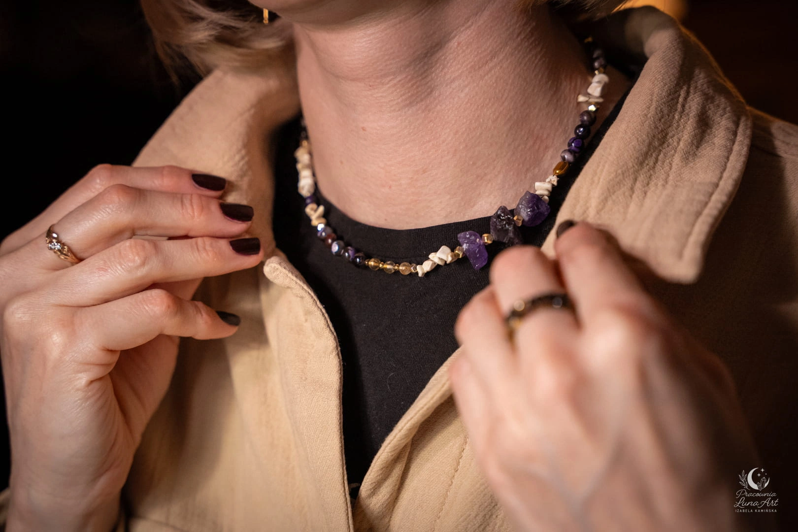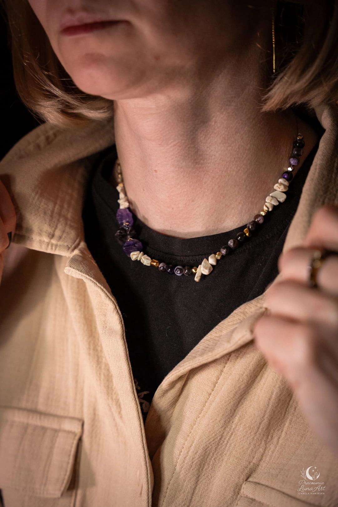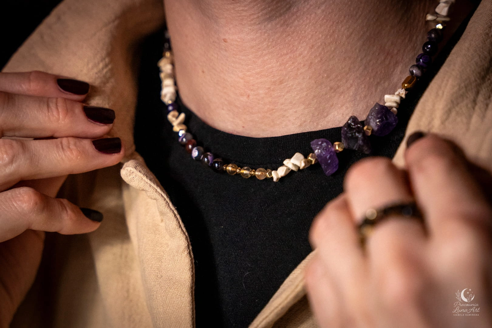 Ten naszyjnik to prawdziwa oda do intuicji i wewnętrznej równowagi. Zestawienie surowych bryłek ametystu z precyzyjnie dobranymi kamieniami tworzy kompozycję, która przyciąga wzrok i intryguje swoją strukturą. To unikatowy, pojedynczy egzemplarz, stworzony dla kobiety, która nie boi się pokazać swojej autentyczności.