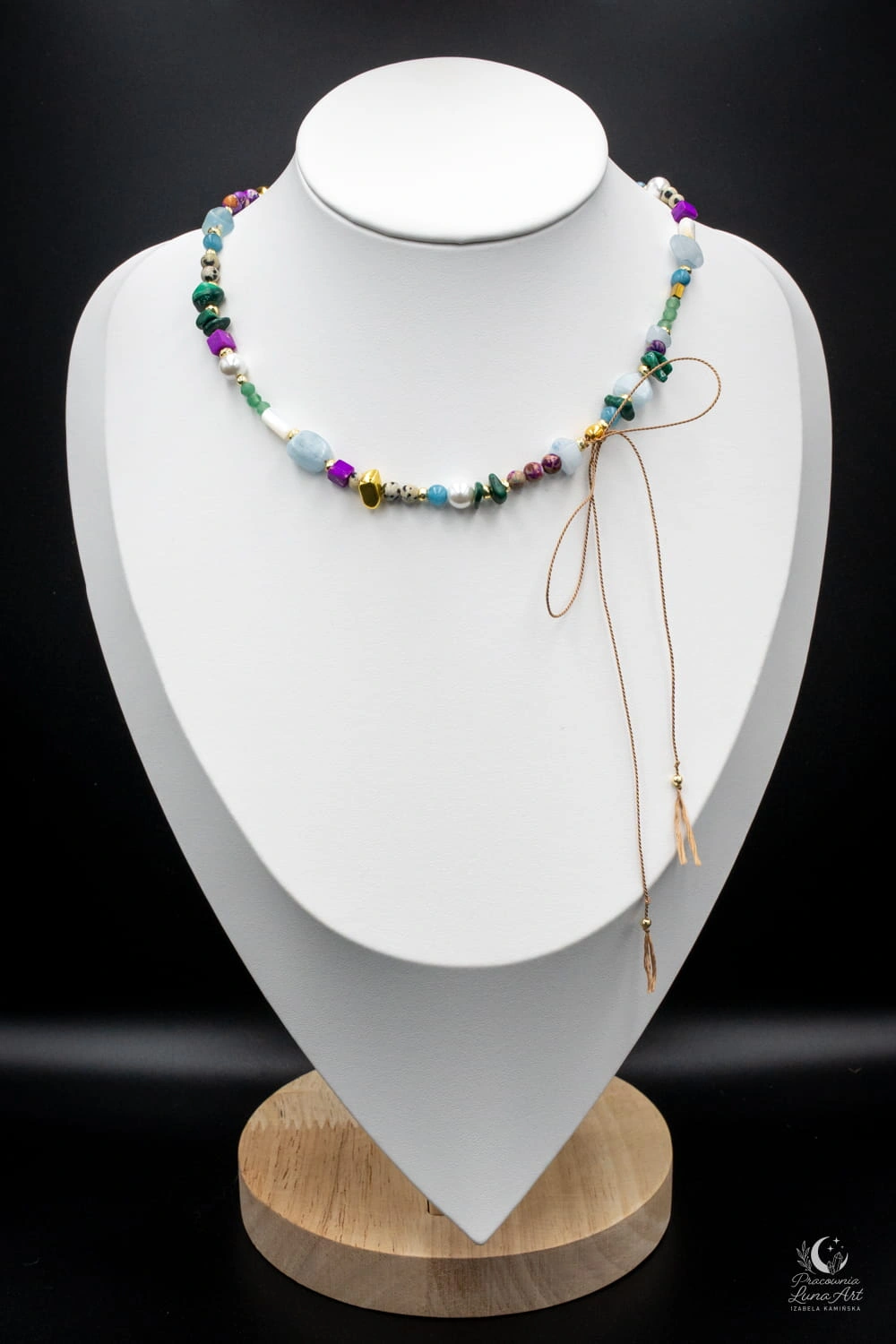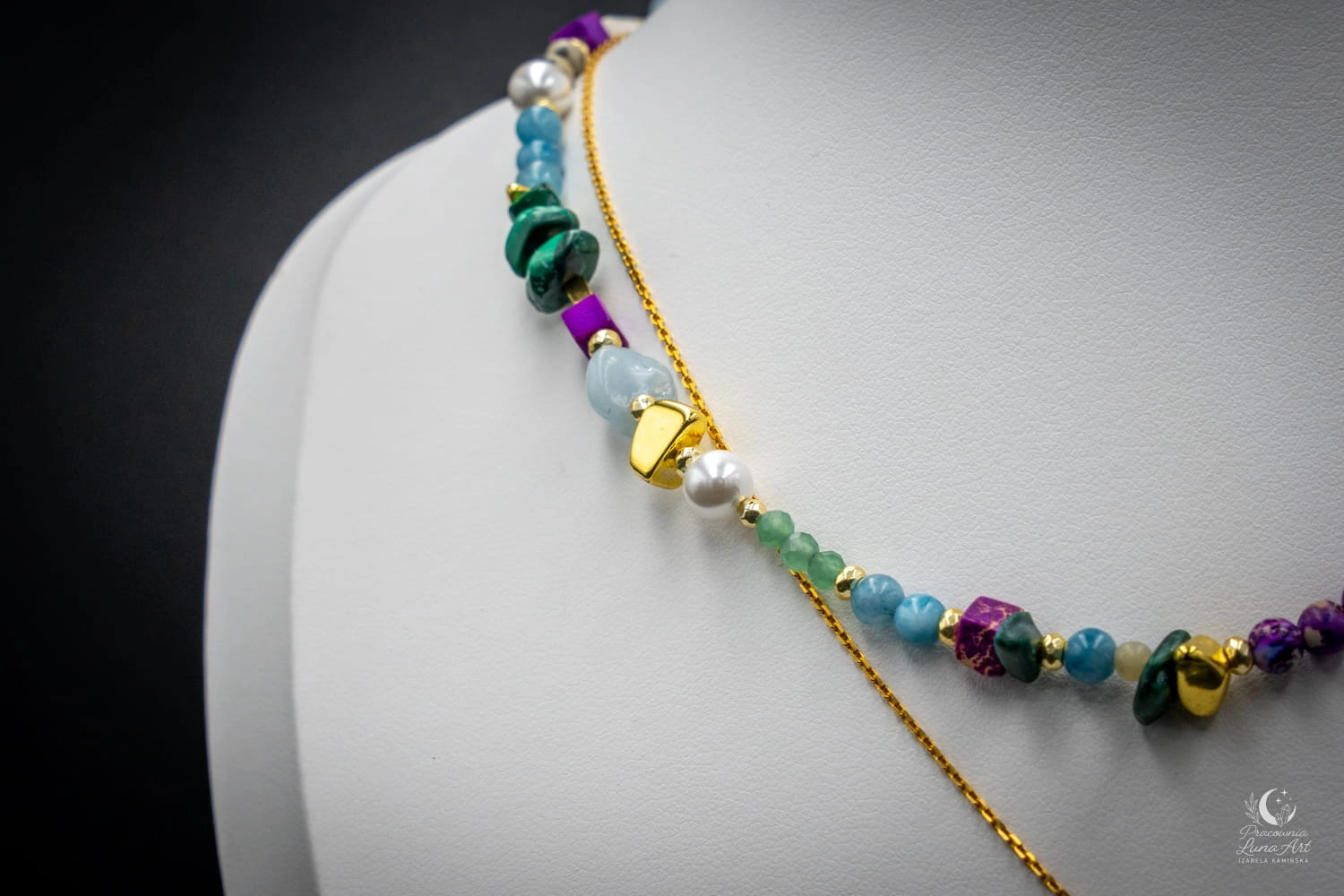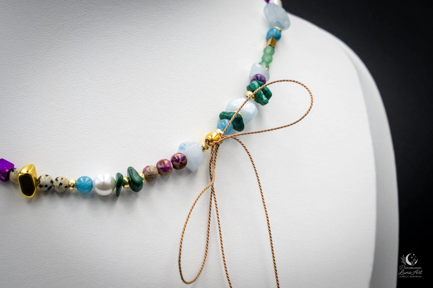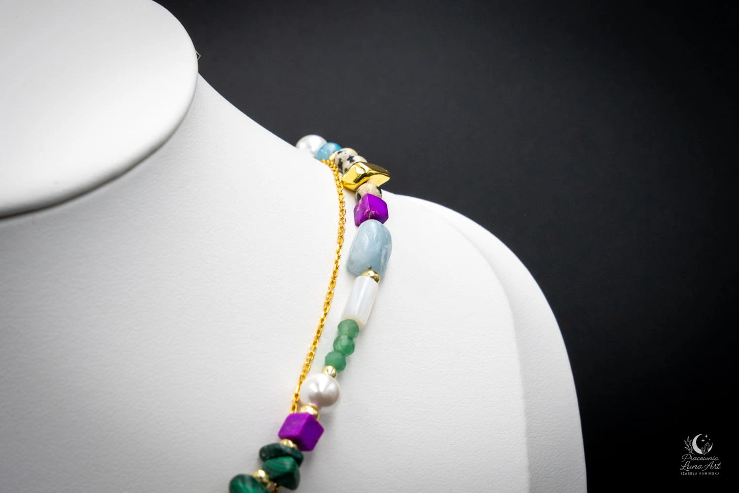 Subtelny, ręcznie wykonany naszyjnik utrzymany w kojącej tonacji zieleni, błękitu i perłowej bieli. Połączenie fakturowanych minerałów z gładką masą perłową nadaje biżuterii świeżości i naturalnej elegancji. Naszyjnik idealnie sprawdzi się jako dopełnienie lekkich, letnich stylizacji oraz jako energetyczny akcent do biurowego stroju. Dzięki zastosowaniu różnorodnych kształtów kamieni, biżuteria przyciąga wzrok i zachwyca unikalnym, rzemieślniczym stylem.