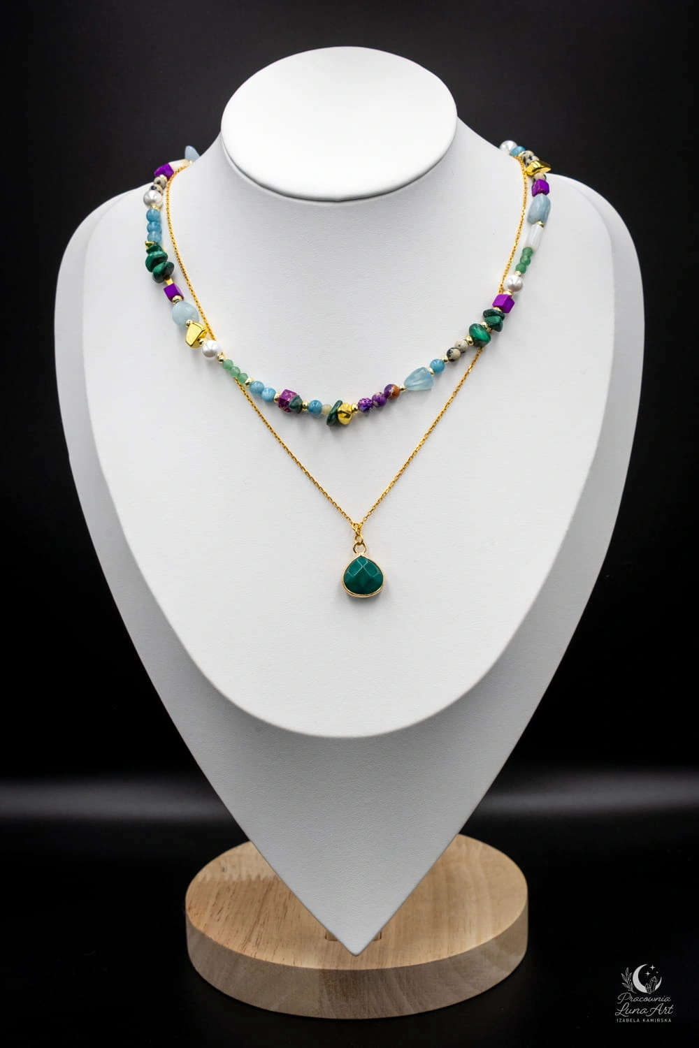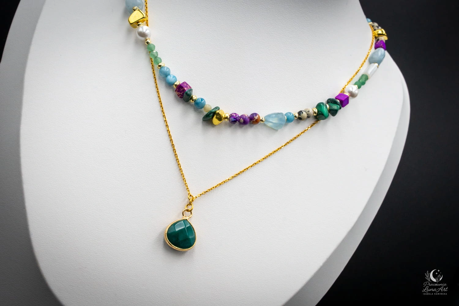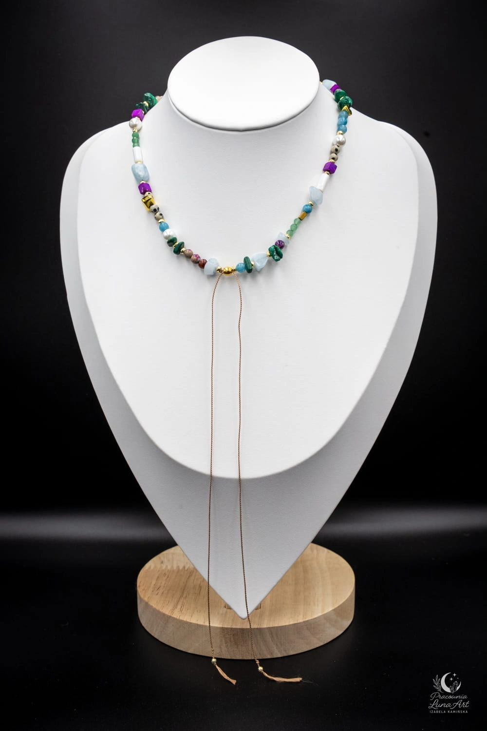 Subtelny, ręcznie wykonany naszyjnik utrzymany w kojącej tonacji zieleni, błękitu i perłowej bieli. Połączenie fakturowanych minerałów z gładką masą perłową nadaje biżuterii świeżości i naturalnej elegancji. Naszyjnik idealnie sprawdzi się jako dopełnienie lekkich, letnich stylizacji oraz jako energetyczny akcent do biurowego stroju. Dzięki zastosowaniu różnorodnych kształtów kamieni, biżuteria przyciąga wzrok i zachwyca unikalnym, rzemieślniczym stylem.