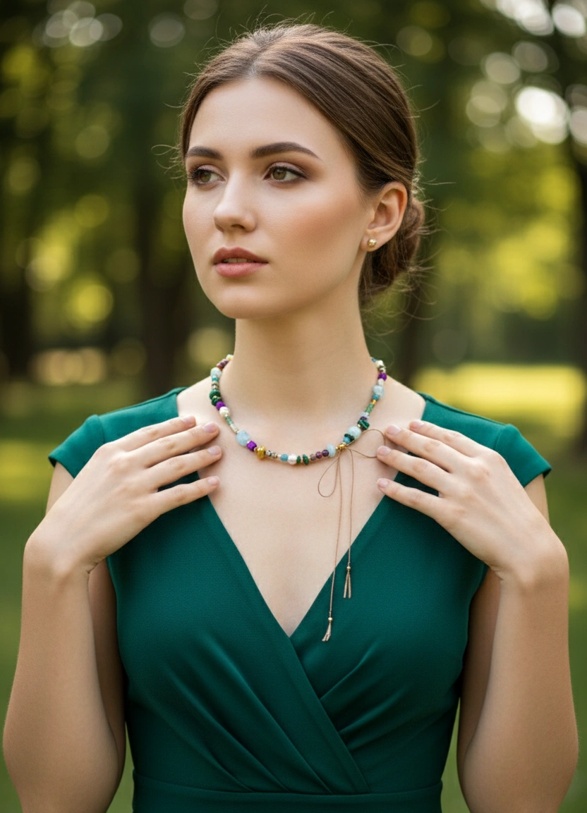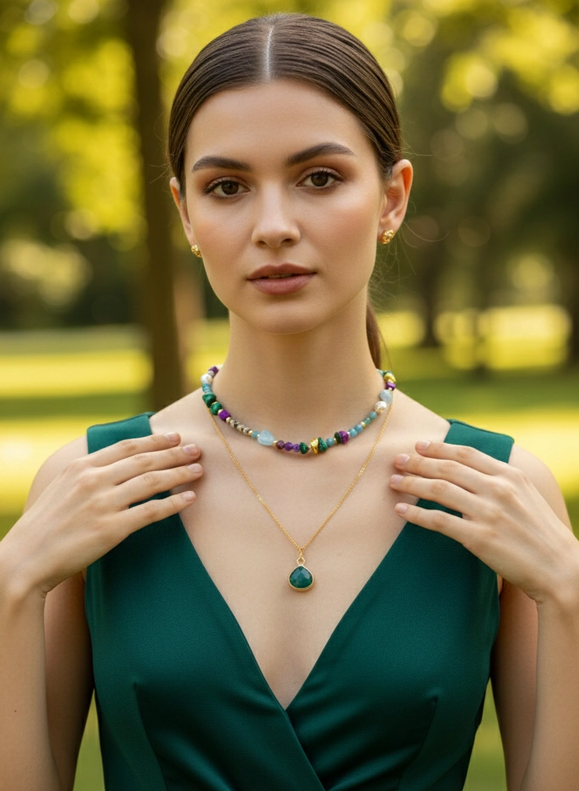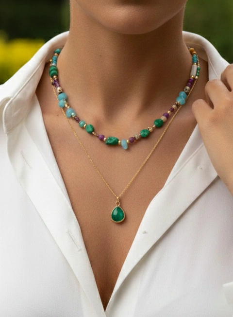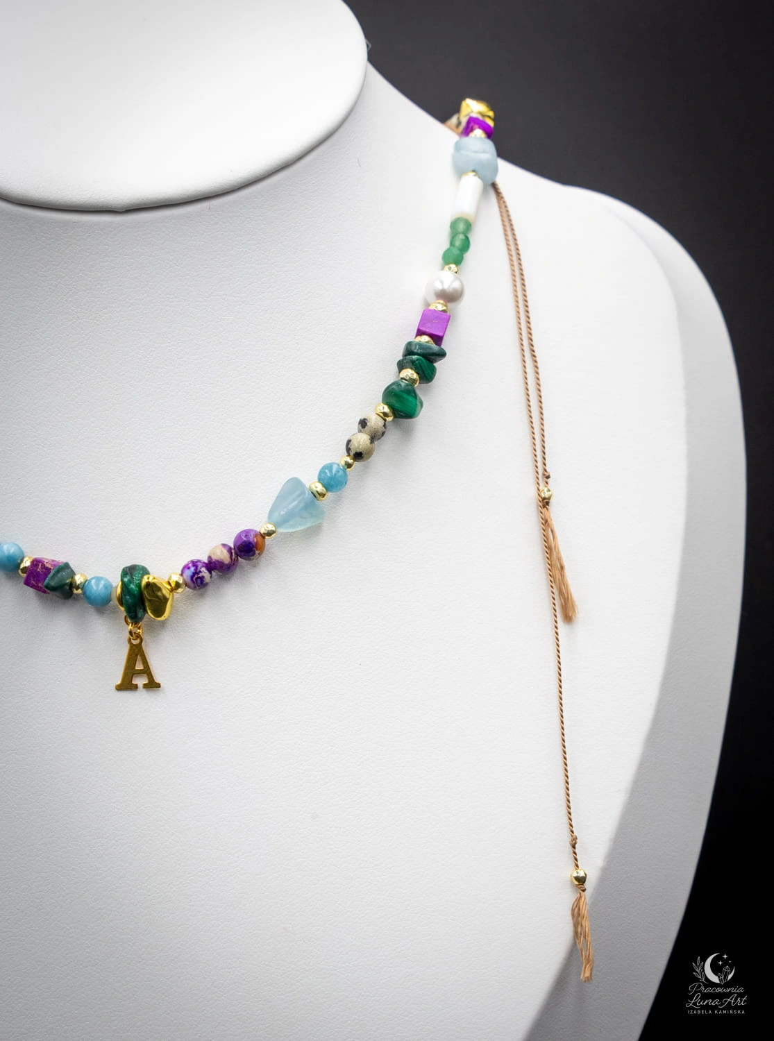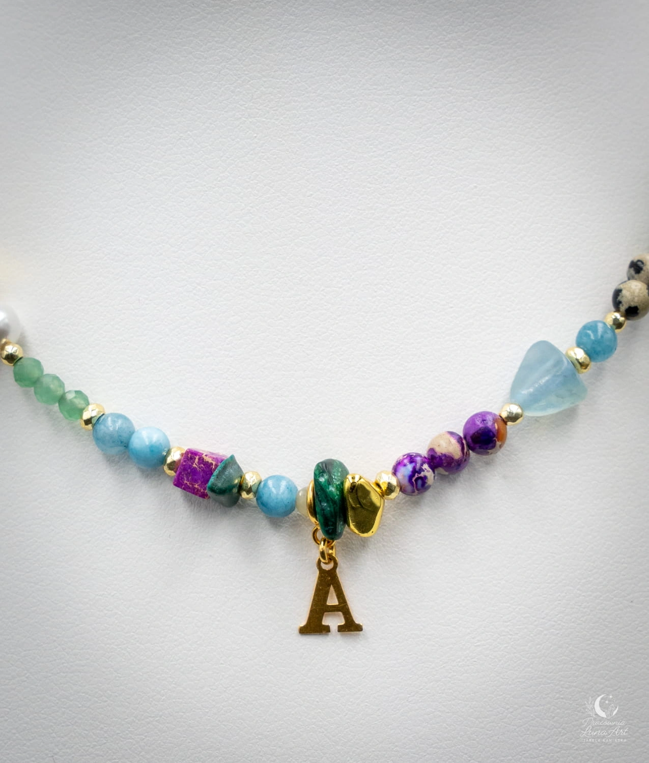 Subtelny, ręcznie wykonany naszyjnik utrzymany w kojącej tonacji zieleni, błękitu i perłowej bieli. Połączenie fakturowanych minerałów z gładką masą perłową nadaje biżuterii świeżości i naturalnej elegancji. Naszyjnik idealnie sprawdzi się jako dopełnienie lekkich, letnich stylizacji oraz jako energetyczny akcent do biurowego stroju. Dzięki zastosowaniu różnorodnych kształtów kamieni, biżuteria przyciąga wzrok i zachwyca unikalnym, rzemieślniczym stylem.