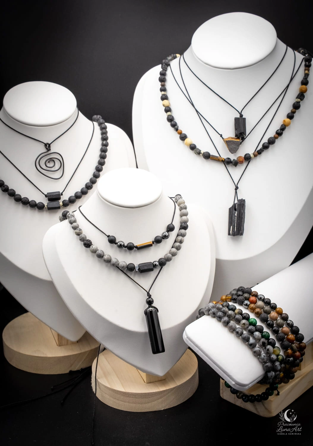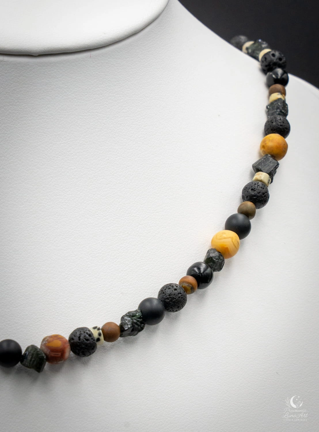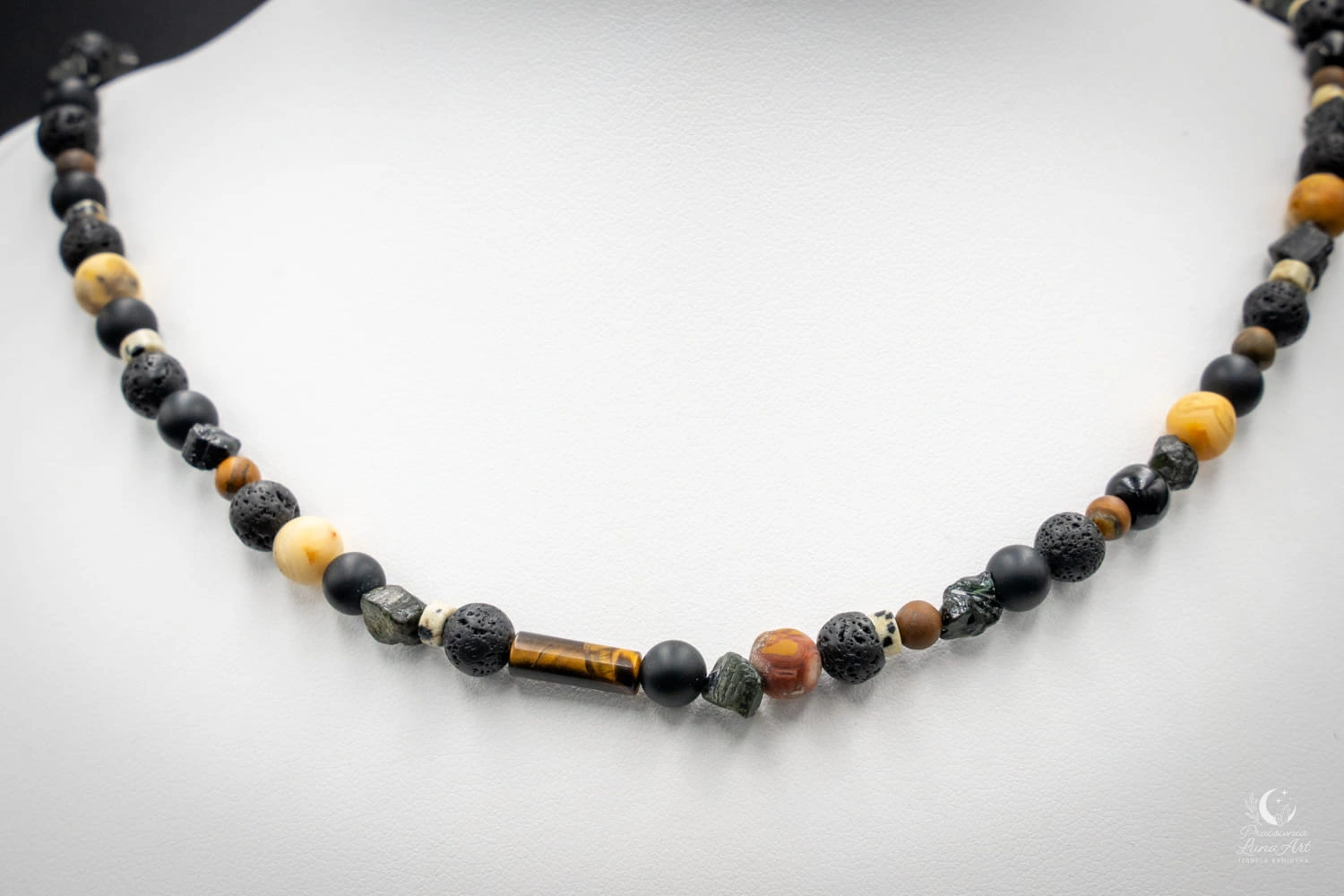 Surowy, ręcznie wykonany naszyjnik męski, zaprojektowany z myślą o mężczyznach ceniących autentyczność i naturalną siłę minerałów. Połączenie głębokiej, matowej czerni lawy wulkanicznej z tygrysim okiem o złotym blasku oraz ziemistymi tonami jaspisu i agatu tworzy biżuterię o zdecydowanym, nowoczesnym charakterze. To nie tylko stylowy dodatek, ale przede wszystkim osobisty talizman wspierający pewność siebie i wewnętrzną równowagę. Kamienie 6mm.