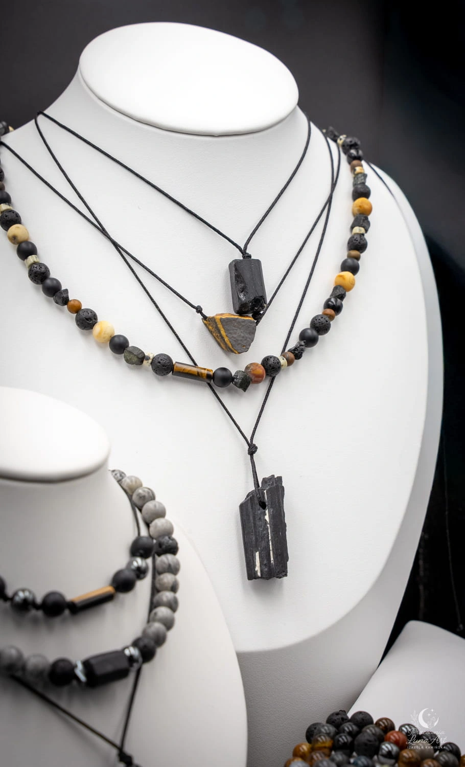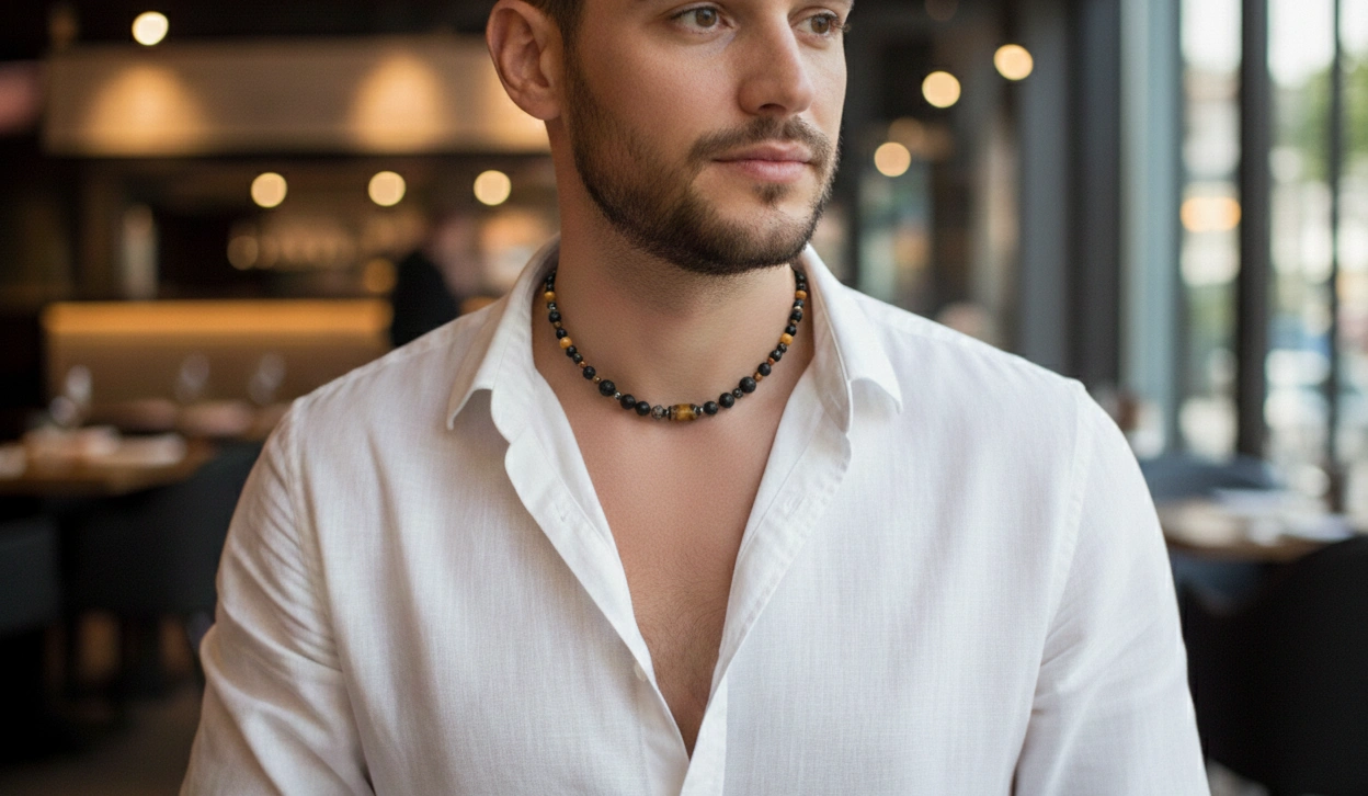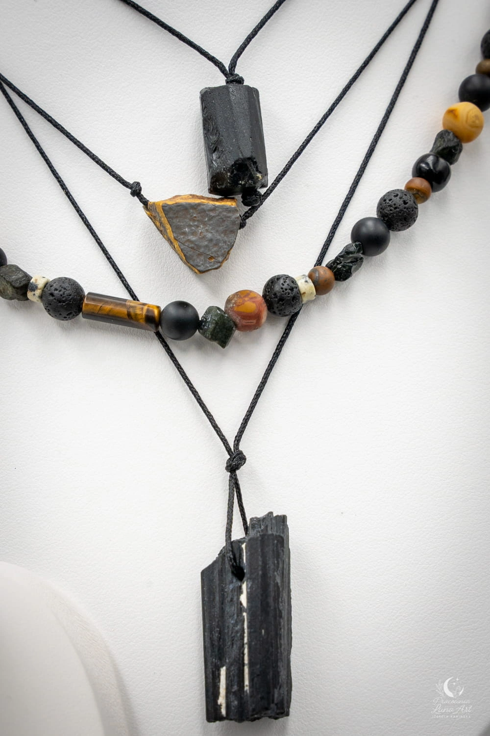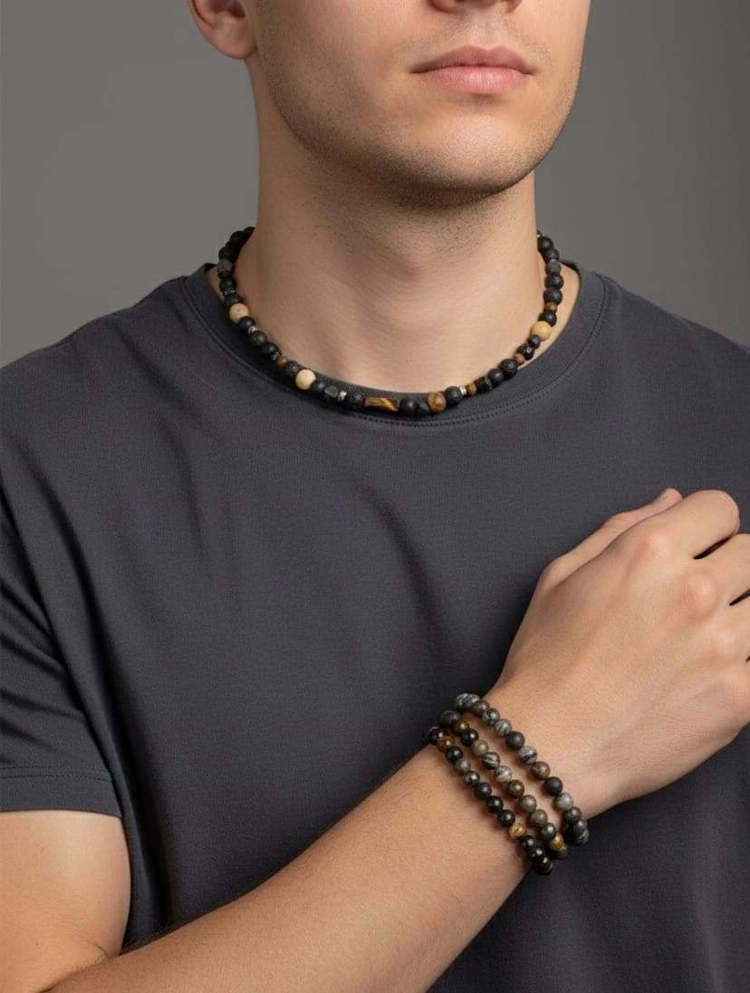 Surowy, ręcznie wykonany naszyjnik męski, zaprojektowany z myślą o mężczyznach ceniących autentyczność i naturalną siłę minerałów. Połączenie głębokiej, matowej czerni lawy wulkanicznej z tygrysim okiem o złotym blasku oraz ziemistymi tonami jaspisu i agatu tworzy biżuterię o zdecydowanym, nowoczesnym charakterze. To nie tylko stylowy dodatek, ale przede wszystkim osobisty talizman wspierający pewność siebie i wewnętrzną równowagę. Kamienie 6mm.