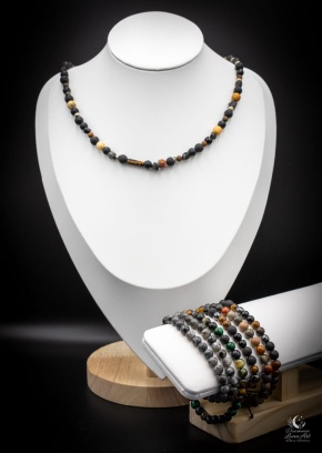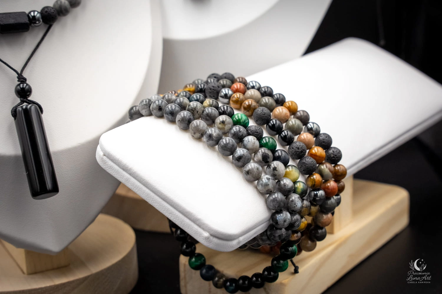 Ta starannie dobrana kompozycja to energetyczna tarcza dla nowoczesnego mężczyzny. Lawa wulkaniczna symbolizuje odrodzenie i połączenie z energią ziemi, dodając siły witalnej. Turmalin zapewnia potężną ochronę przed negatywnymi wpływami, a tygrysie oko wzmacnia pewność siebie i odwagę w podejmowaniu wyzwań. Jaspis i agat działają gruntująco, przynosząc spokój i stabilizację, natomiast hematyt wspomaga koncentrację i regenerację sił.