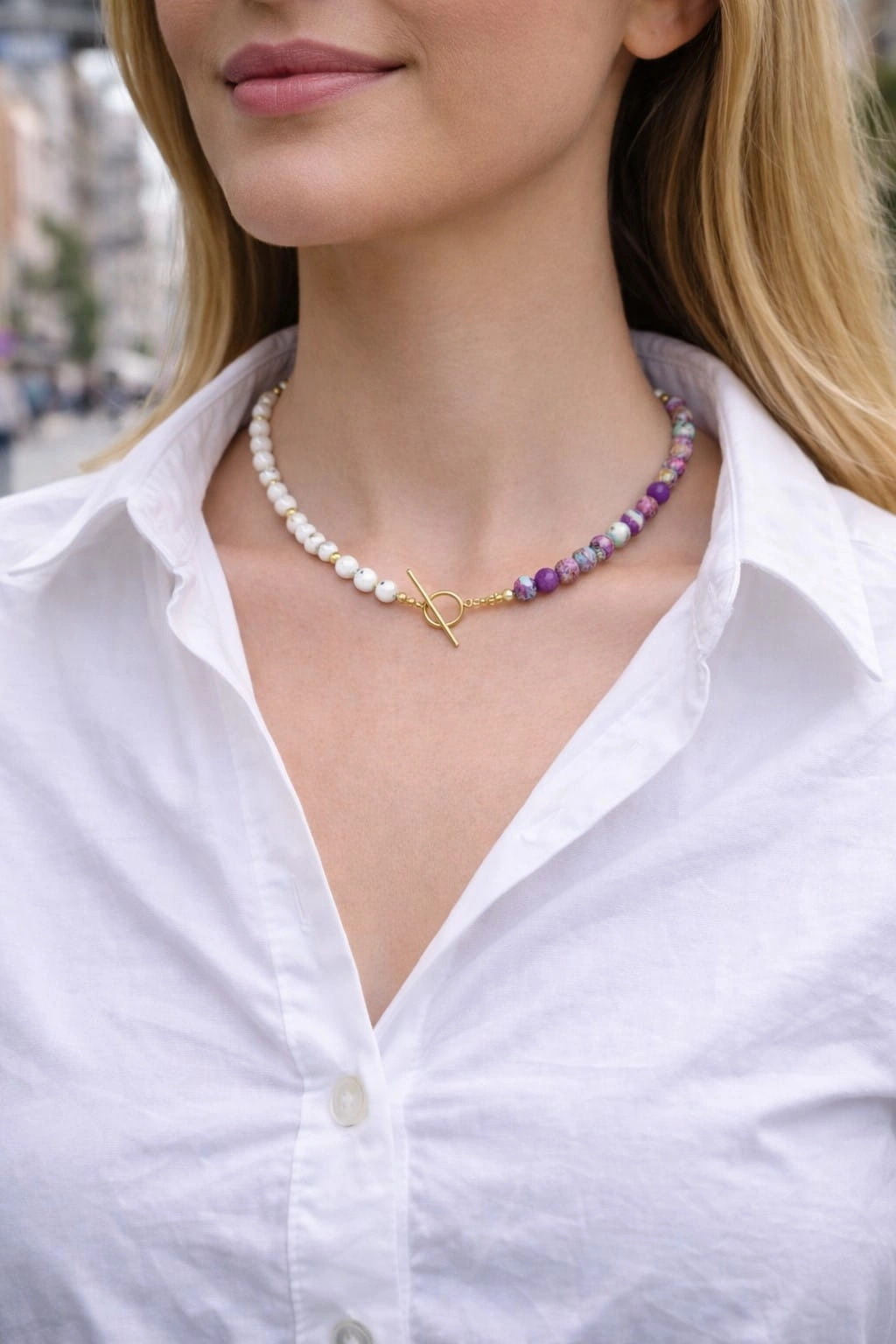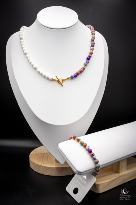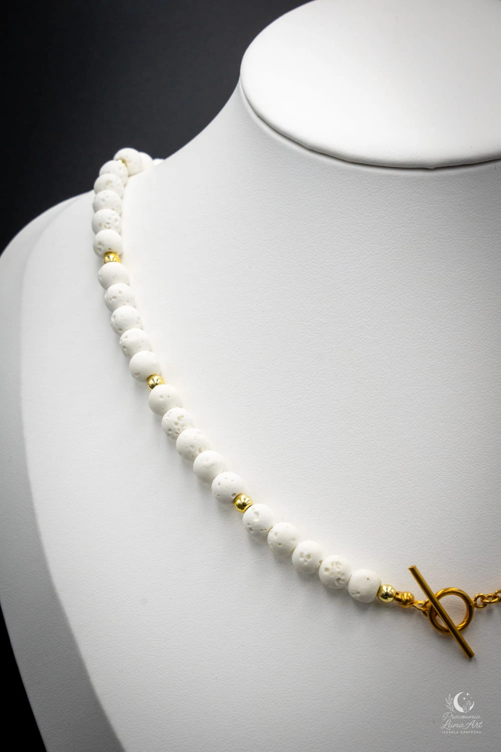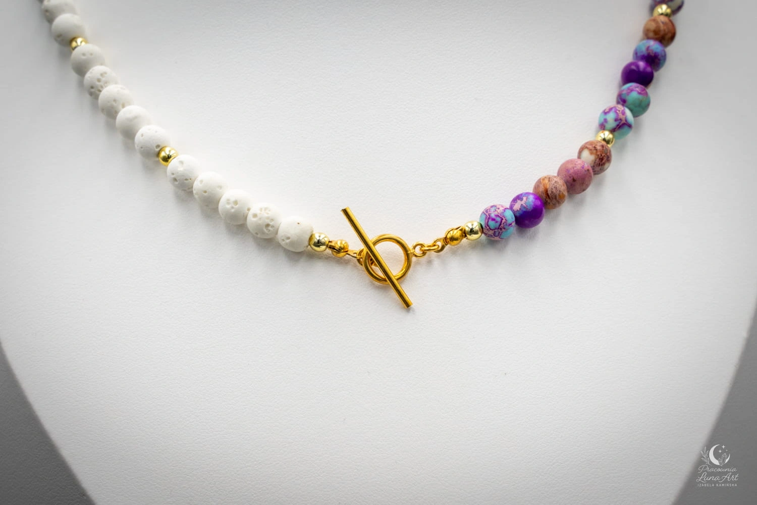 Elegancki i wyrazisty naszyjnik z zapięciem typu toggle, wykonany z naturalnych kamieni: lawy wulkanicznej, jaspisu cesarskiego oraz hematytu. Surowa, matowa struktura lawy wulkanicznej kontrastuje z bogatą kolorystyką jaspisu cesarskiego i subtelnym, metalicznym połyskiem hematytu, tworząc spójną i charakterystyczną kompozycję. Ozdobne zapięcie toggle stanowi integralny element designu i jednocześnie wygodne zapięcie. Wszystkie elementy metalowe wykonane są ze srebra próby 925 pozłacanego, co nadaje biżuterii ciepły, elegancki blask.