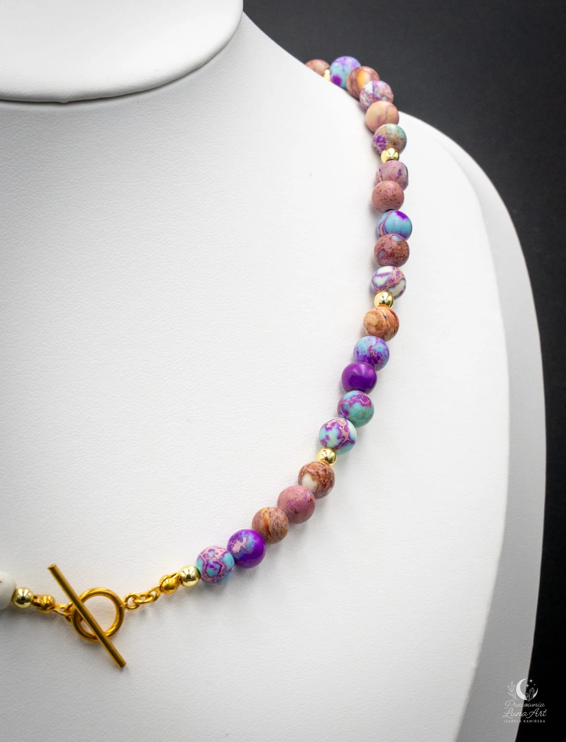 Naszyjnik ma długość 43 cm i nie posiada możliwości regulacji, dzięki czemu układa się stabilnie na szyi i pięknie podkreśla dekolt. To propozycja dla osób ceniących naturalne kamienie, wyrazisty styl i nowoczesną formę.