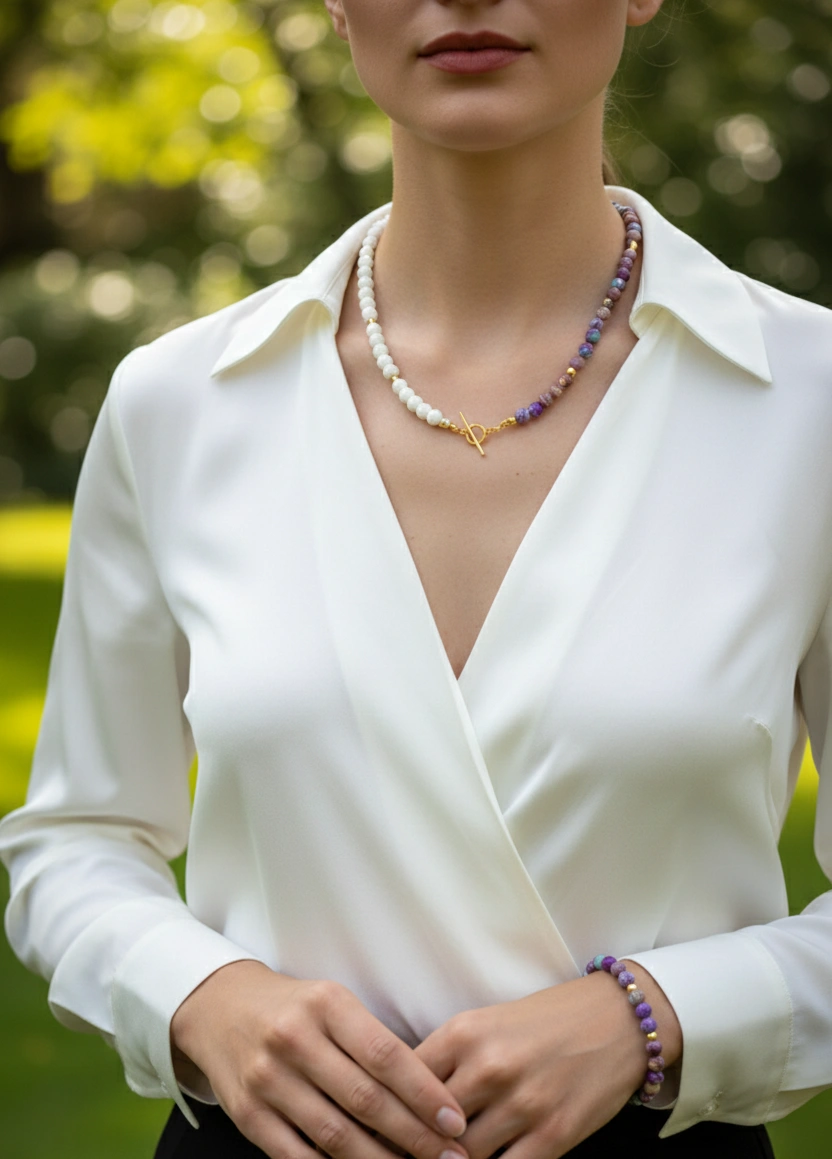 Lawa wulkaniczna, jaspis cesarski i hematyt tworzą połączenie symbolizujące stabilność, ochronę i wewnętrzną siłę. Lawa wulkaniczna ugruntowuje i dodaje odporności, jaspis cesarski wzmacnia pewność siebie oraz harmonię emocjonalną, a hematyt chroni przed negatywną energią i pomaga zachować równowagę. Razem tworzą naszyjnik o mocy spokoju, stabilności i naturalnej energii, idealny jako codzienny amulet wspierający wewnętrzny balans.