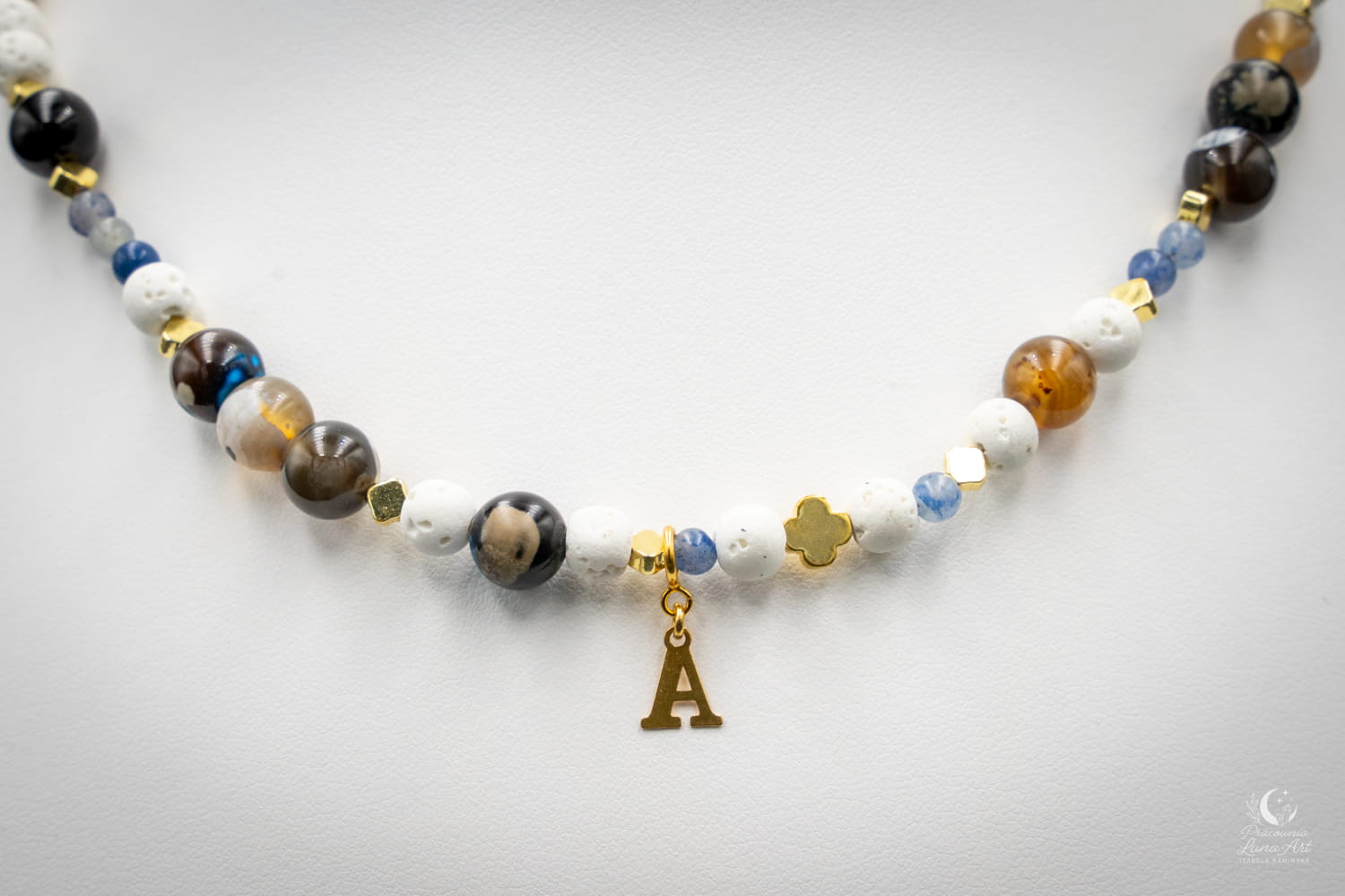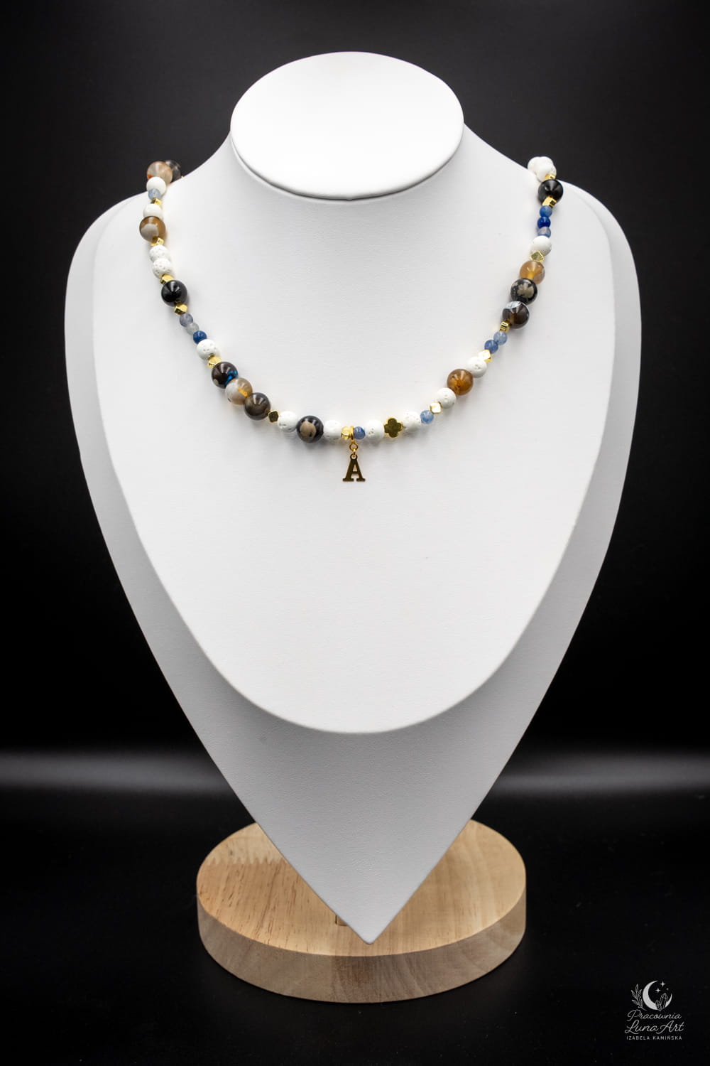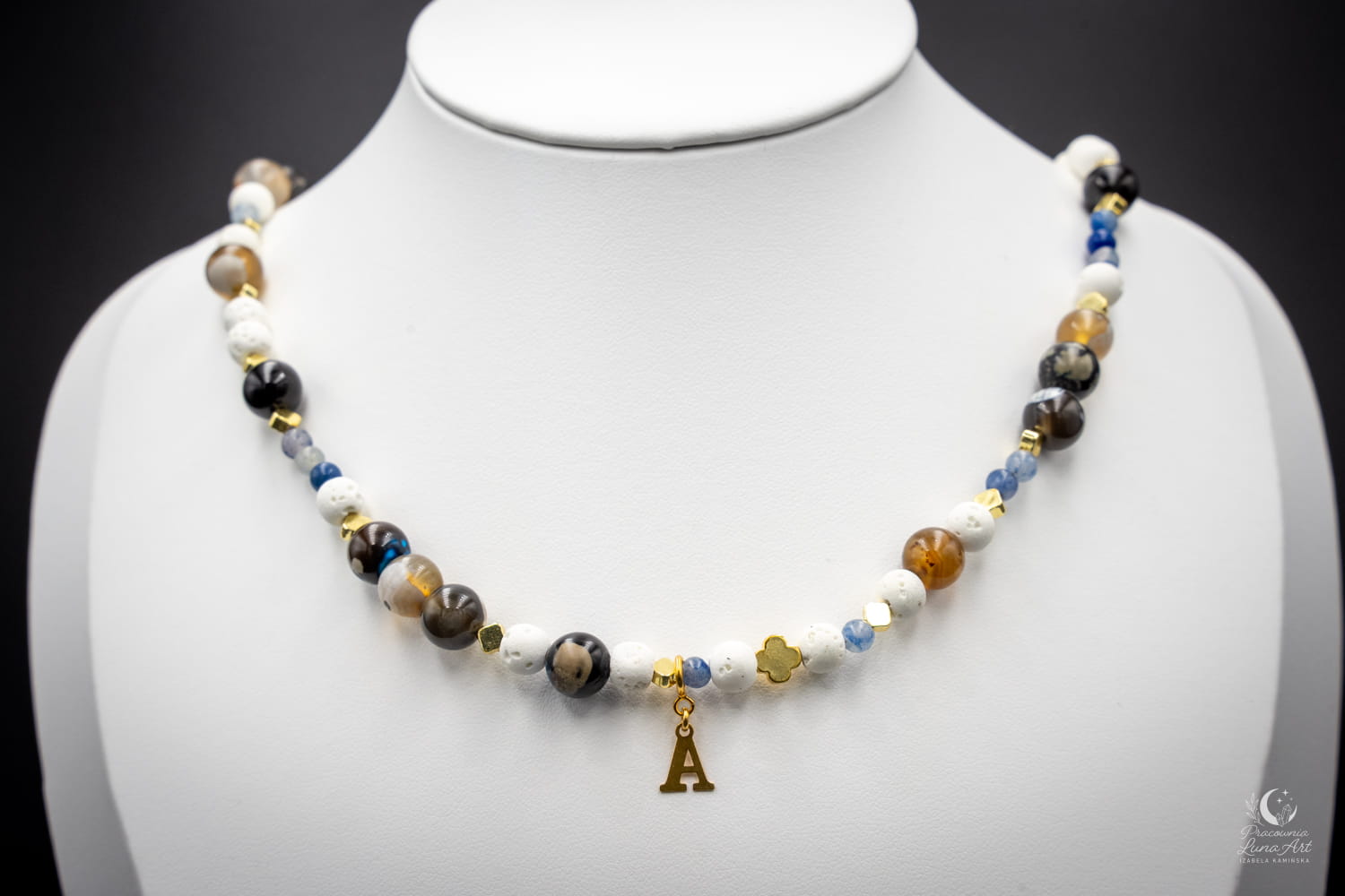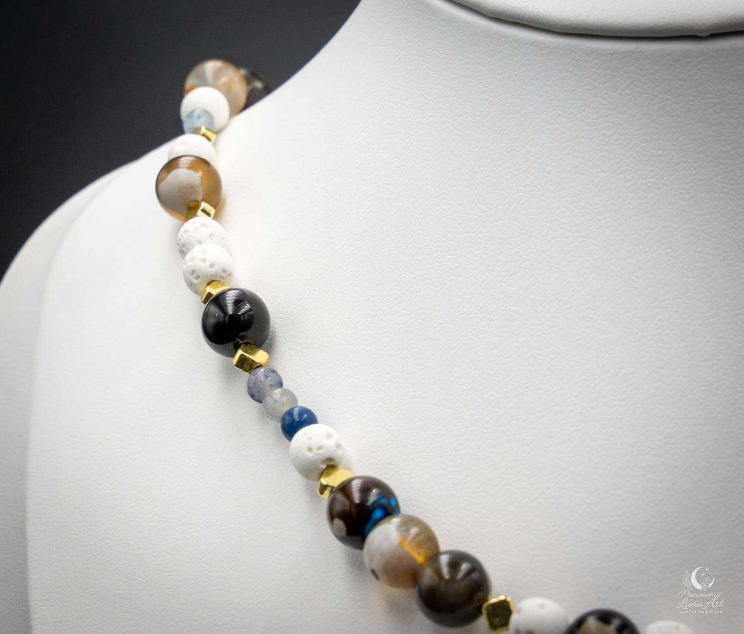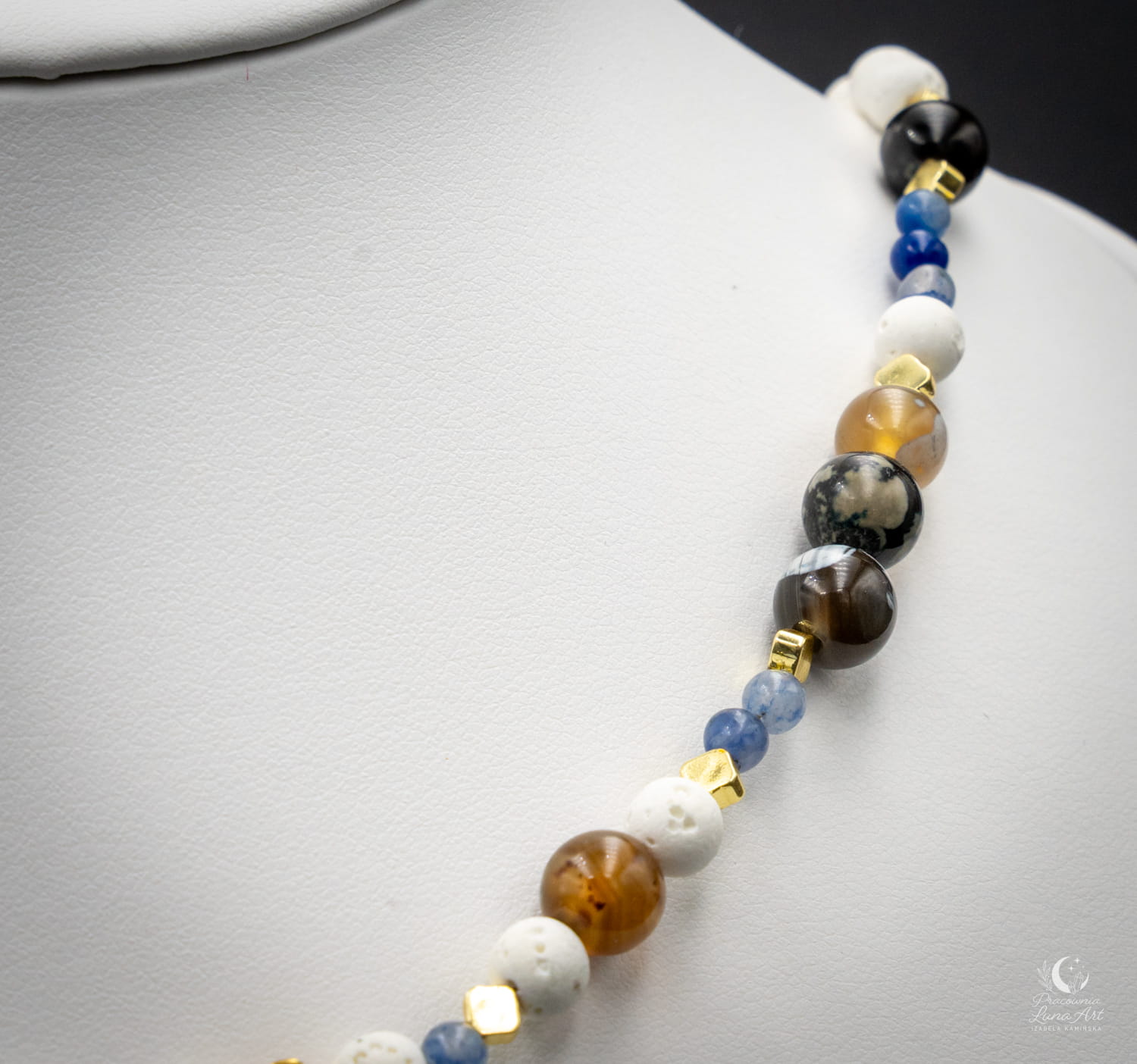 Naszyjnik wykonany z naturalnych kamieni: agatu, akwamarynu, lawy wulkanicznej oraz hematytu, tworzy elegancką i wyważoną kompozycję kolorów oraz faktur. Połączenie matowej lawy z delikatnym połyskiem hematytu i subtelną transparentnością akwamarynu nadaje biżuterii nowoczesny, a jednocześnie ponadczasowy charakter. Kamienie zostały nawleczone z dbałością o proporcje, dzięki czemu naszyjnik pięknie układa się na szyi i sprawdzi się zarówno w codziennych, jak i bardziej eleganckich stylizacjach. Całość wykończona jest srebrem próby 925 pozłacanym, z klasycznym i wygodnym zapięciem typu federing.