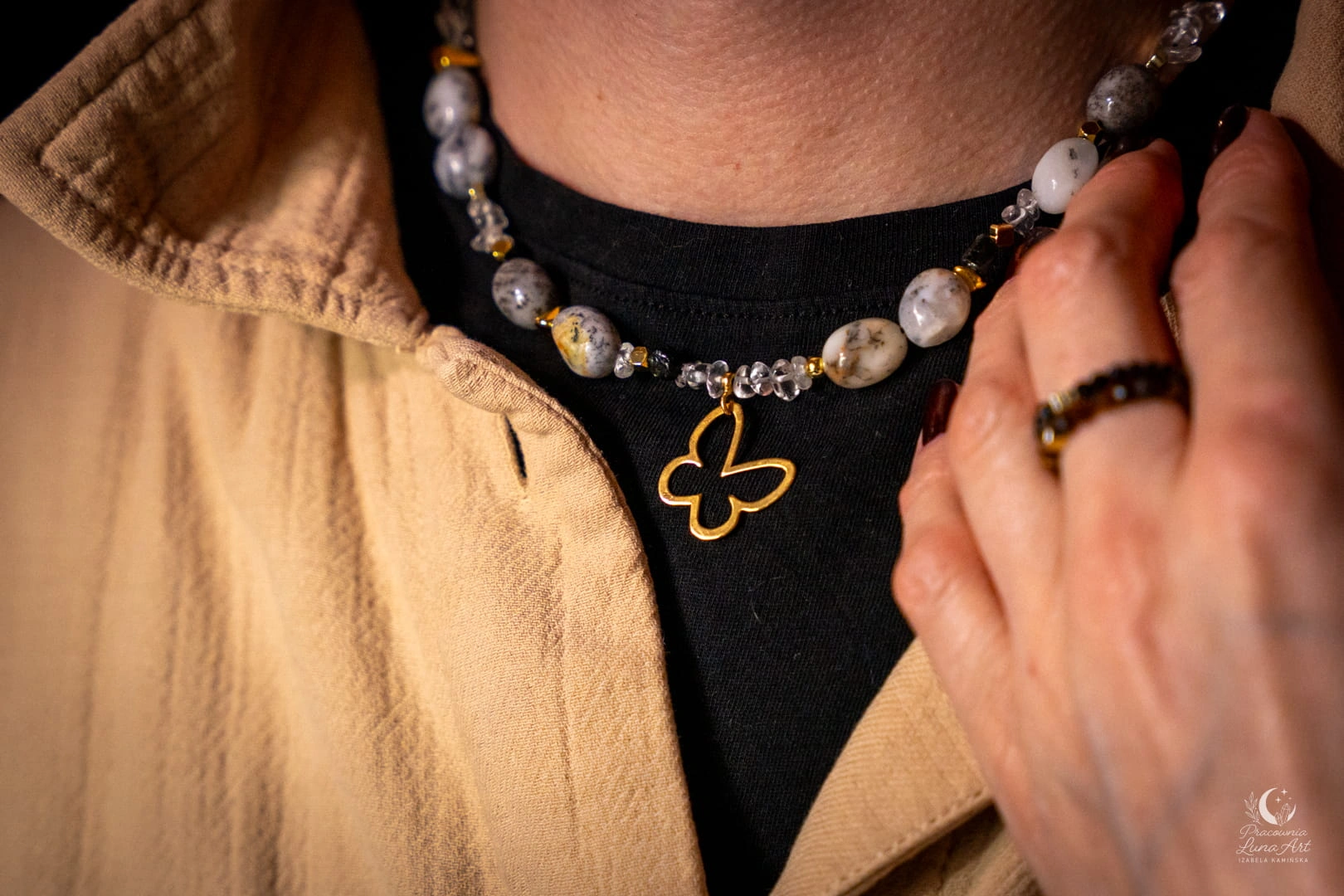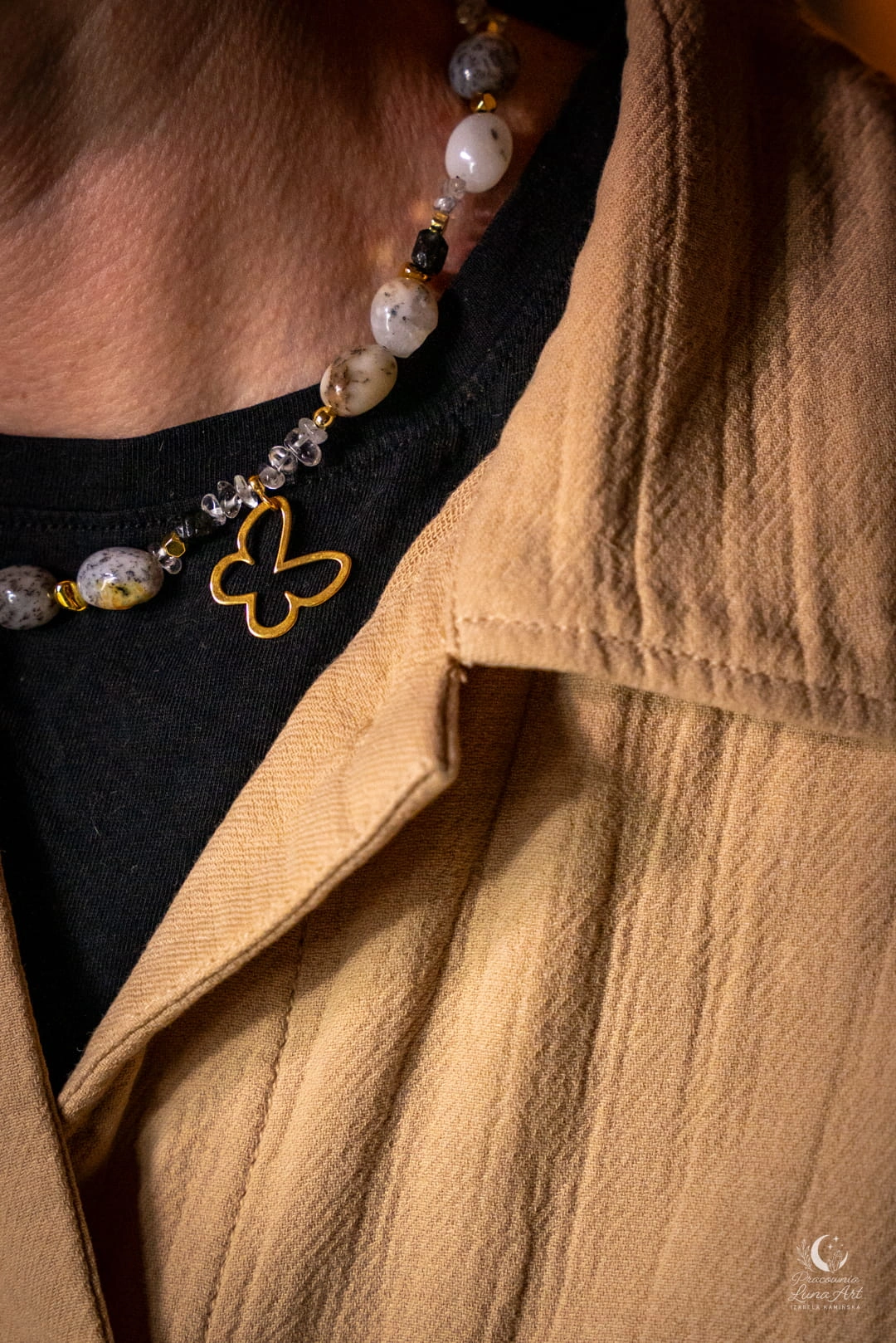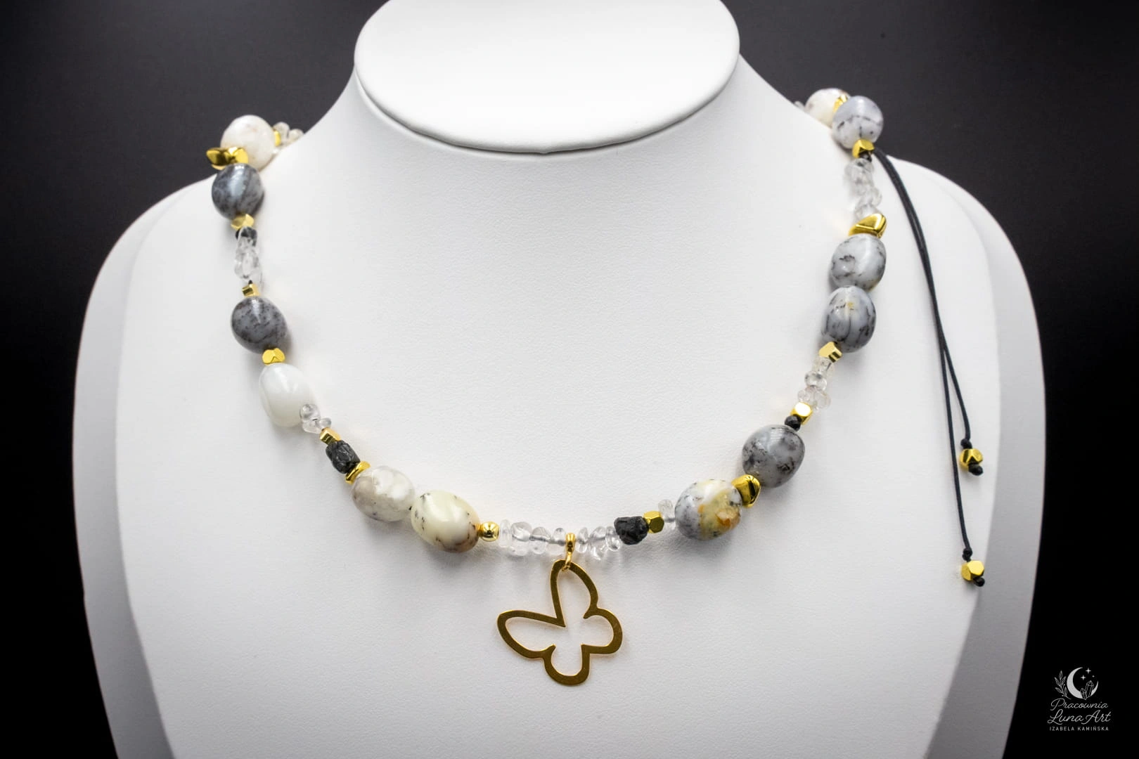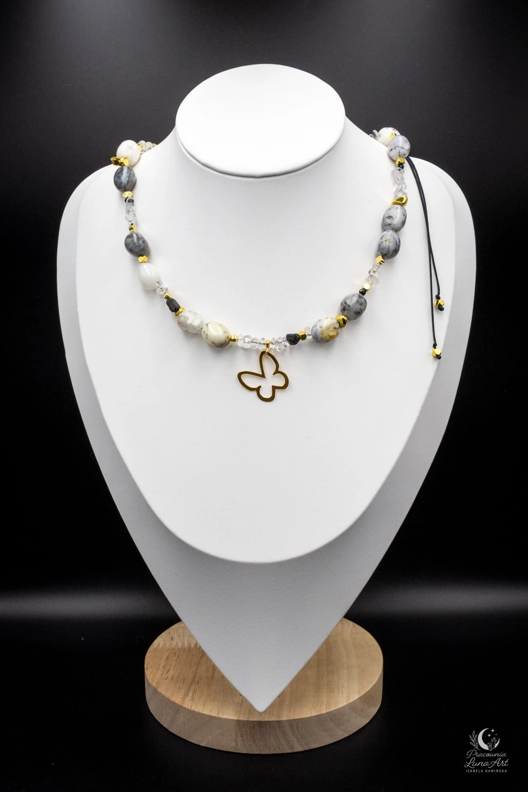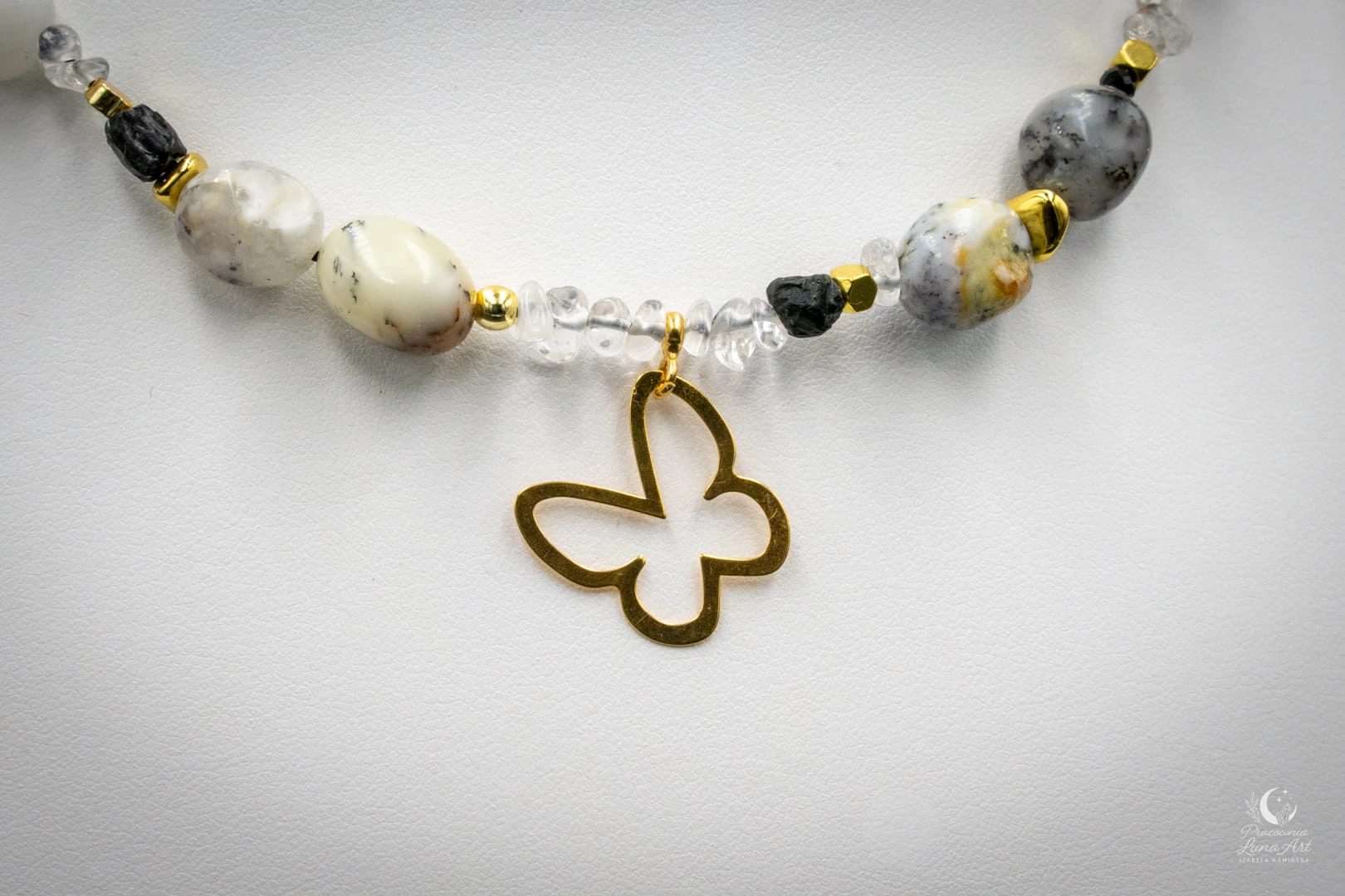 Ten naszyjnik to połączenie świetlistości, ochrony i lekkości, uosobionej przez subtelną zawieszkę motyla. Zestawienie mlecznych opali z krystaliczną czystością kwarcu i głęboką czernią turmalinu tworzy projekt pełen klasy i duchowej równowagi. Jest to unikatowy, pojedynczy egzemplarz, stworzony dla kobiety, która pragnie nosić przy sobie symbol przemiany i siły.