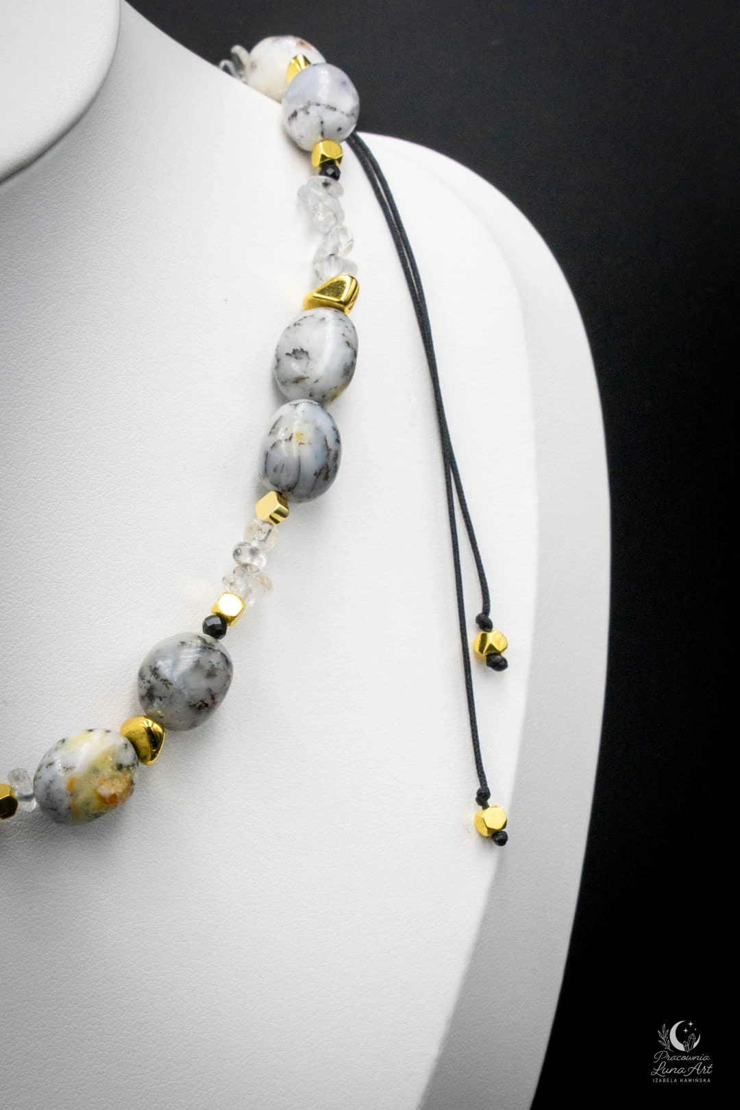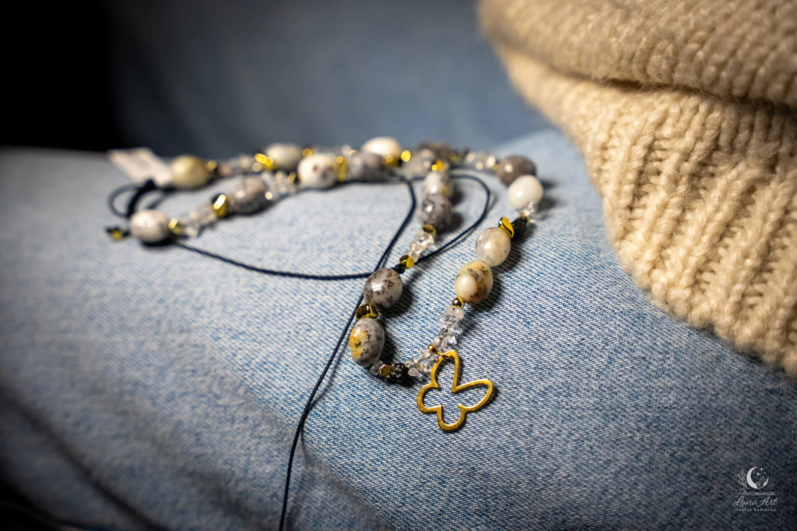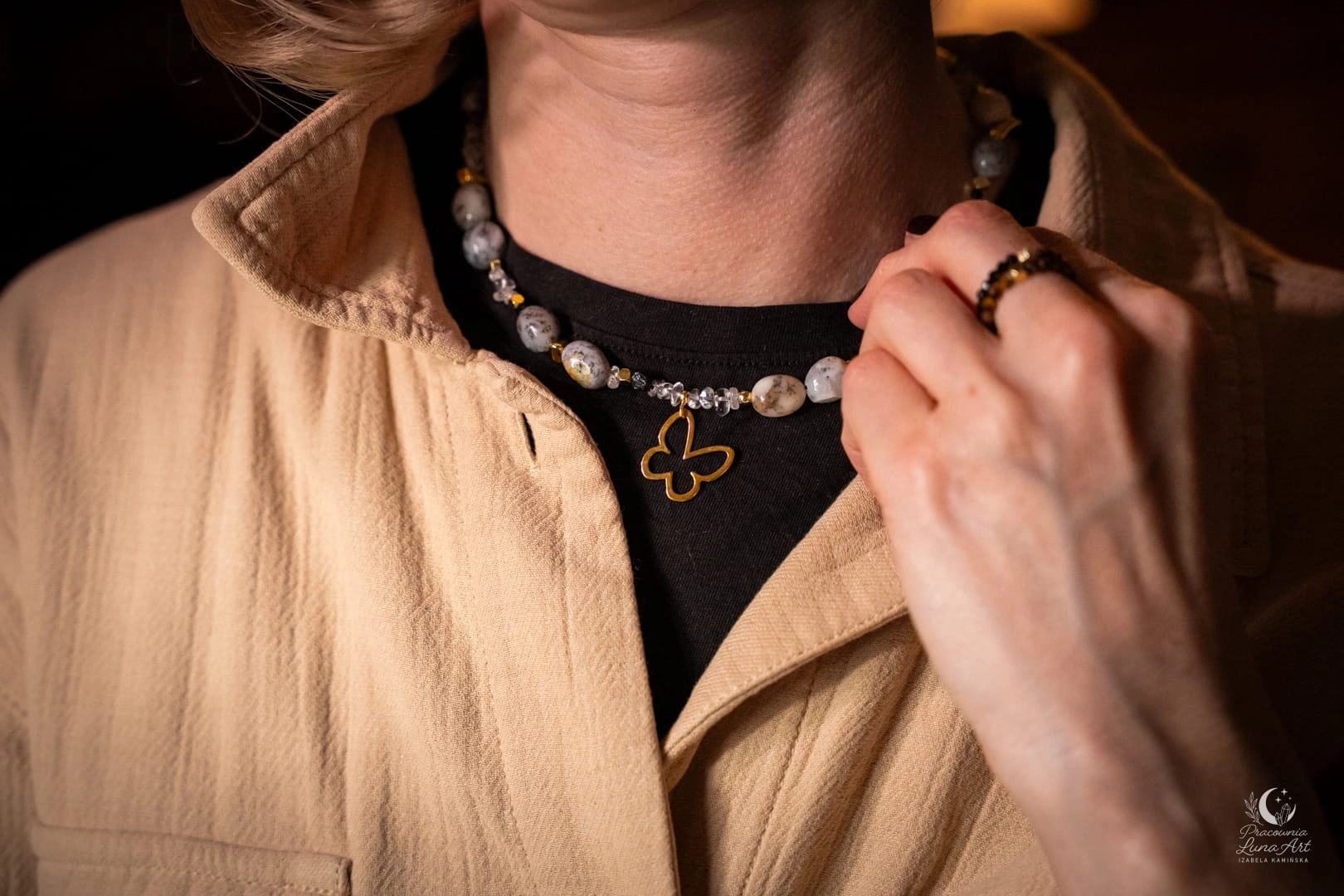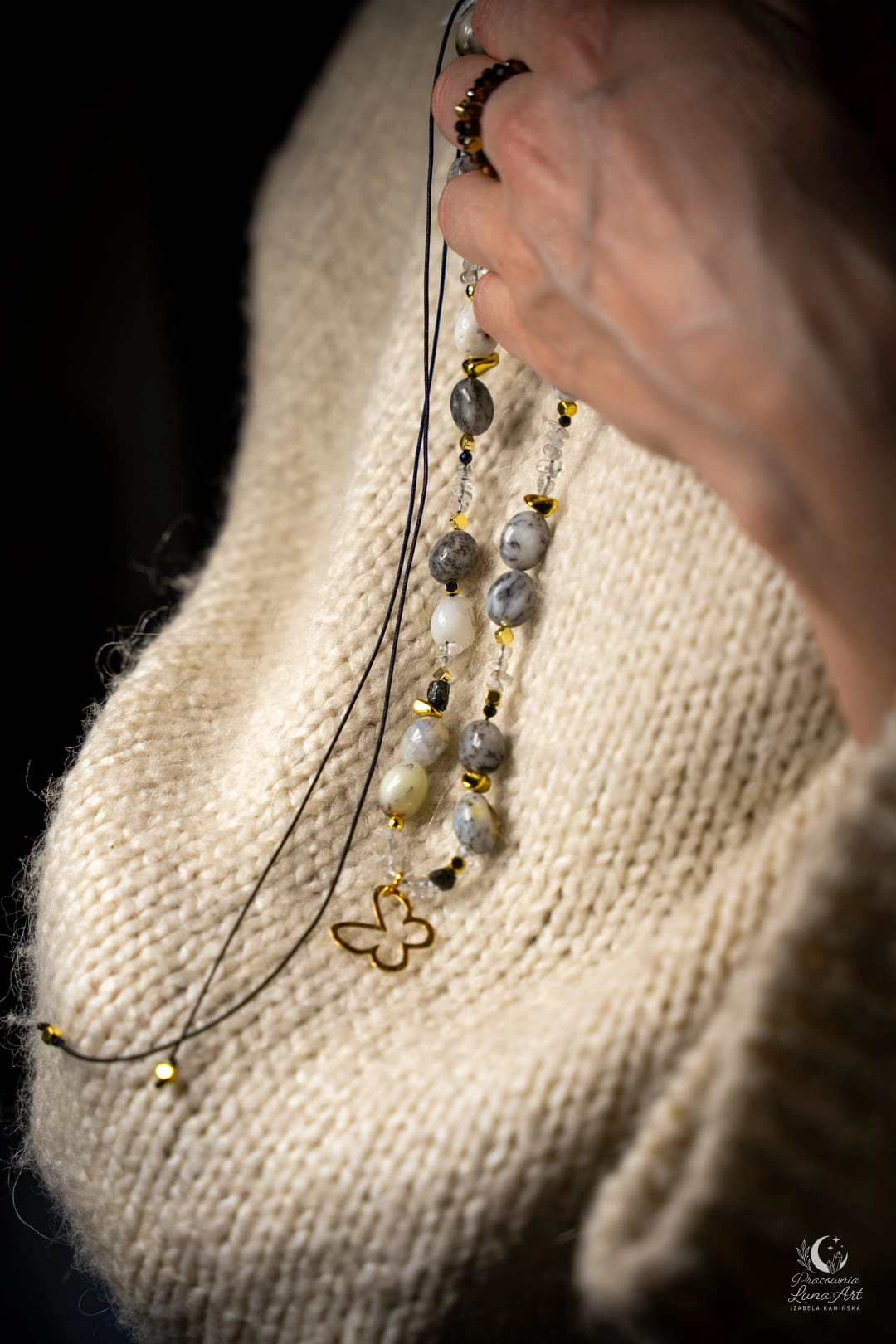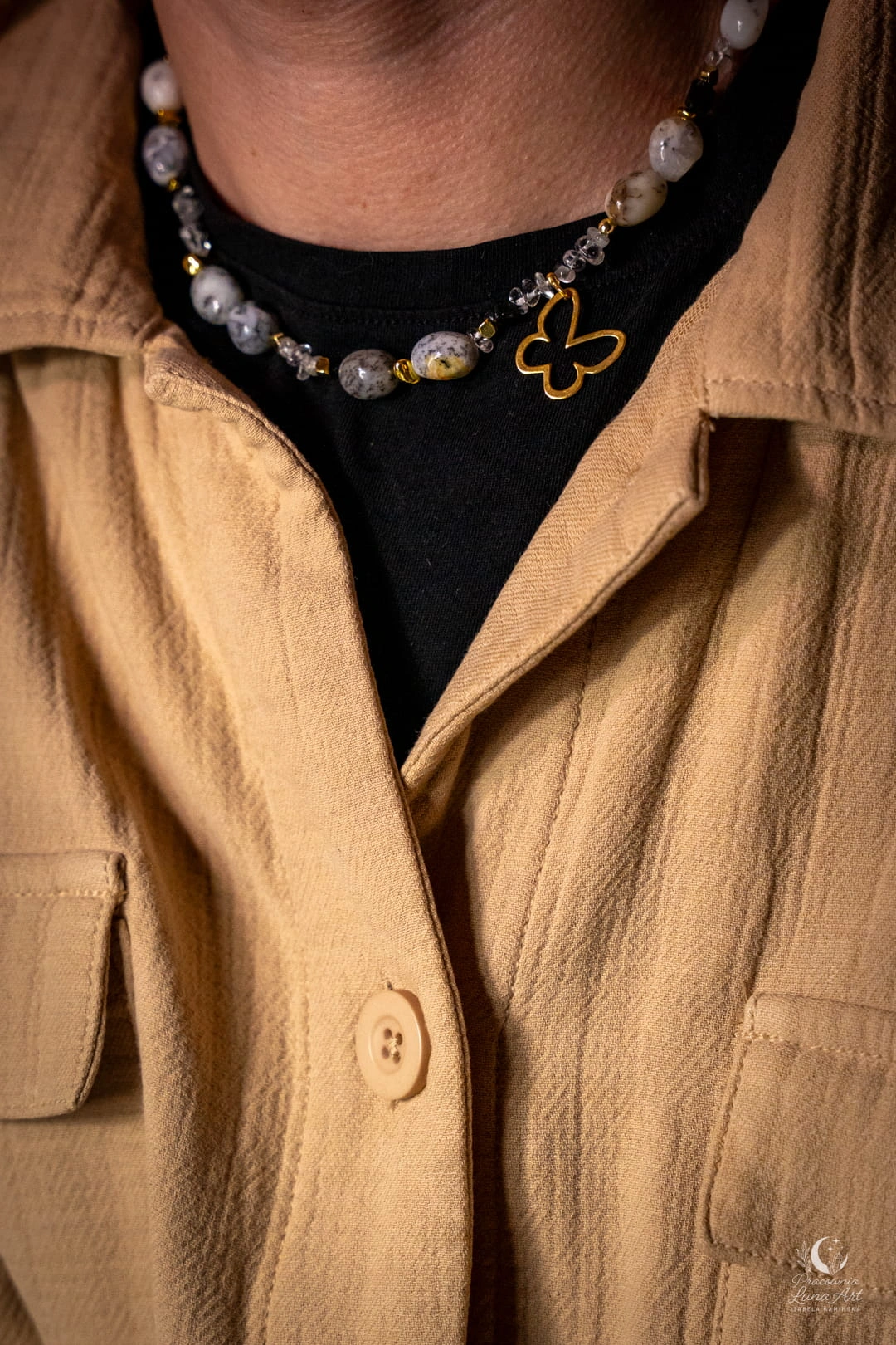 Ten naszyjnik to połączenie świetlistości, ochrony i lekkości, uosobionej przez subtelną zawieszkę motyla. Zestawienie mlecznych opali z krystaliczną czystością kwarcu i głęboką czernią turmalinu tworzy projekt pełen klasy i duchowej równowagi. Jest to unikatowy, pojedynczy egzemplarz, stworzony dla kobiety, która pragnie nosić przy sobie symbol przemiany i siły.