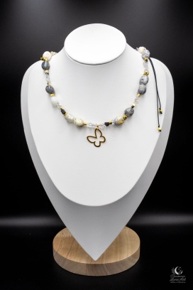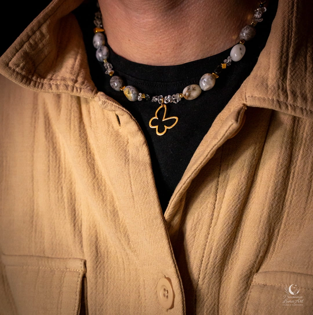 Odkryj biżuterię, która opowiada historię o wolności i wewnętrznym blasku. Centralnym punktem tego unikatowego naszyjnika jest zawieszka w kształcie motyla o wielkości 18 mm, wykonana ze srebra pozłacanego p.925 , która nadaje całości wyjątkowej lekkości. To projekt jednostkowy – wybierając go, zyskujesz pewność, że nikt inny nie posiada identycznego talizmanu.