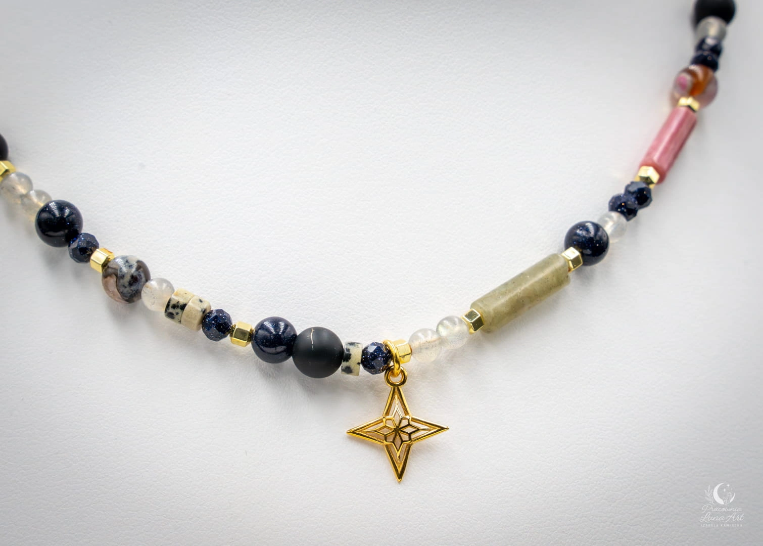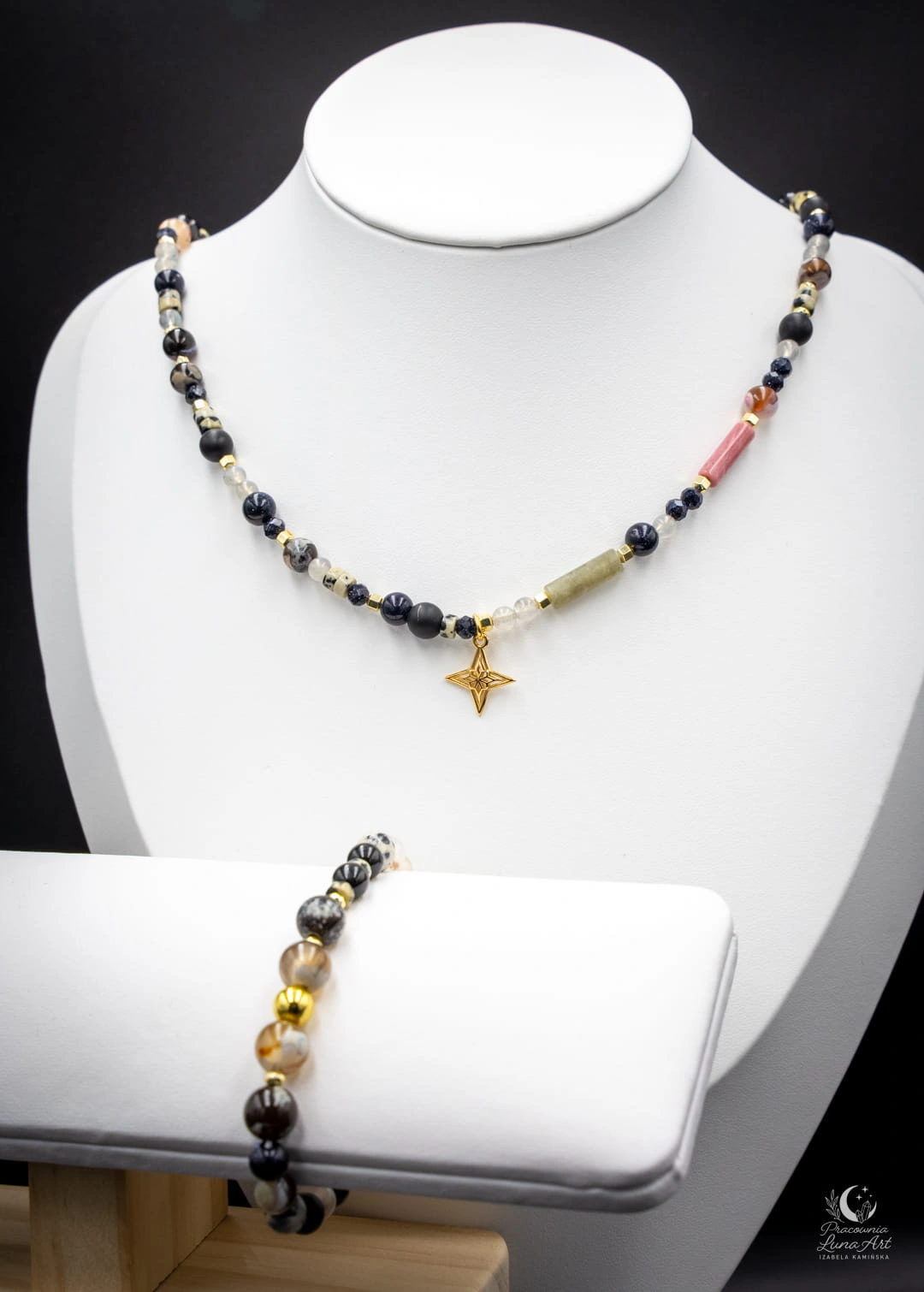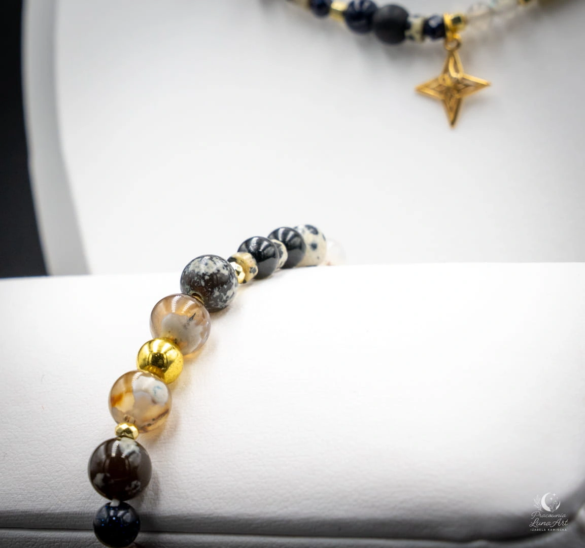 Ręcznie wykonany zestaw biżuterii w naturalnych, głębokich tonacjach ziemi, przełamanych subtelnym blaskiem kryształu i migotliwą strukturą Nocy Kairu. Kompozycja łączy różnorodność faktur – od mlecznej miękkości agatu, przez charakterystyczne plamki jaspisu dalmatyńskiego, po hipnotyzujący połysk labradorytu. Całość dopełnia zawieszka w kształcie róży wiatrów – symbol drogi, odwagi i podążania za własnym kierunkiem. Zestaw idealny dla osób, które cenią biżuterię z przesłaniem oraz naturalne piękno kamieni.