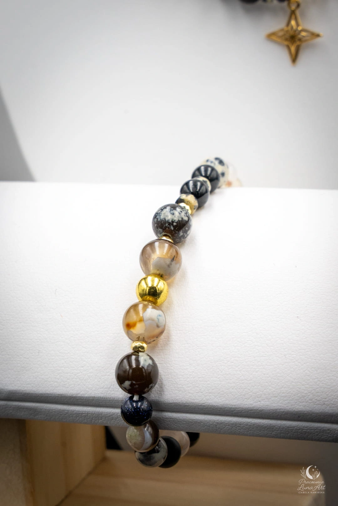 Połączenie Agatu, Jaspisu dalmatyńskiego, Labradorytu, Rodonitu, Nocy Kairu oraz Kryształu górskiego tworzy harmonijny bukiet energii, który łączy stabilność z intuicją, lekkość z determinacją oraz serce z wewnętrzną siłą. To kompozycja wspierająca: równowagę emocjonalną i spokój wewnętrzny odwagę w podejmowaniu decyzji zaufanie własnej intuicji pozytywne nastawienie i lekkość działania koncentrację na celach i realizację planów.