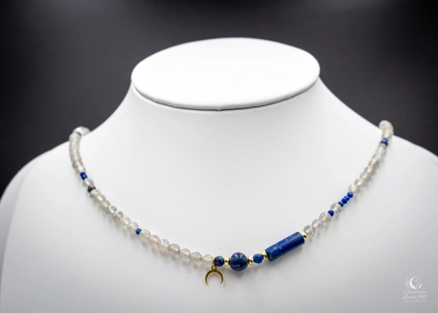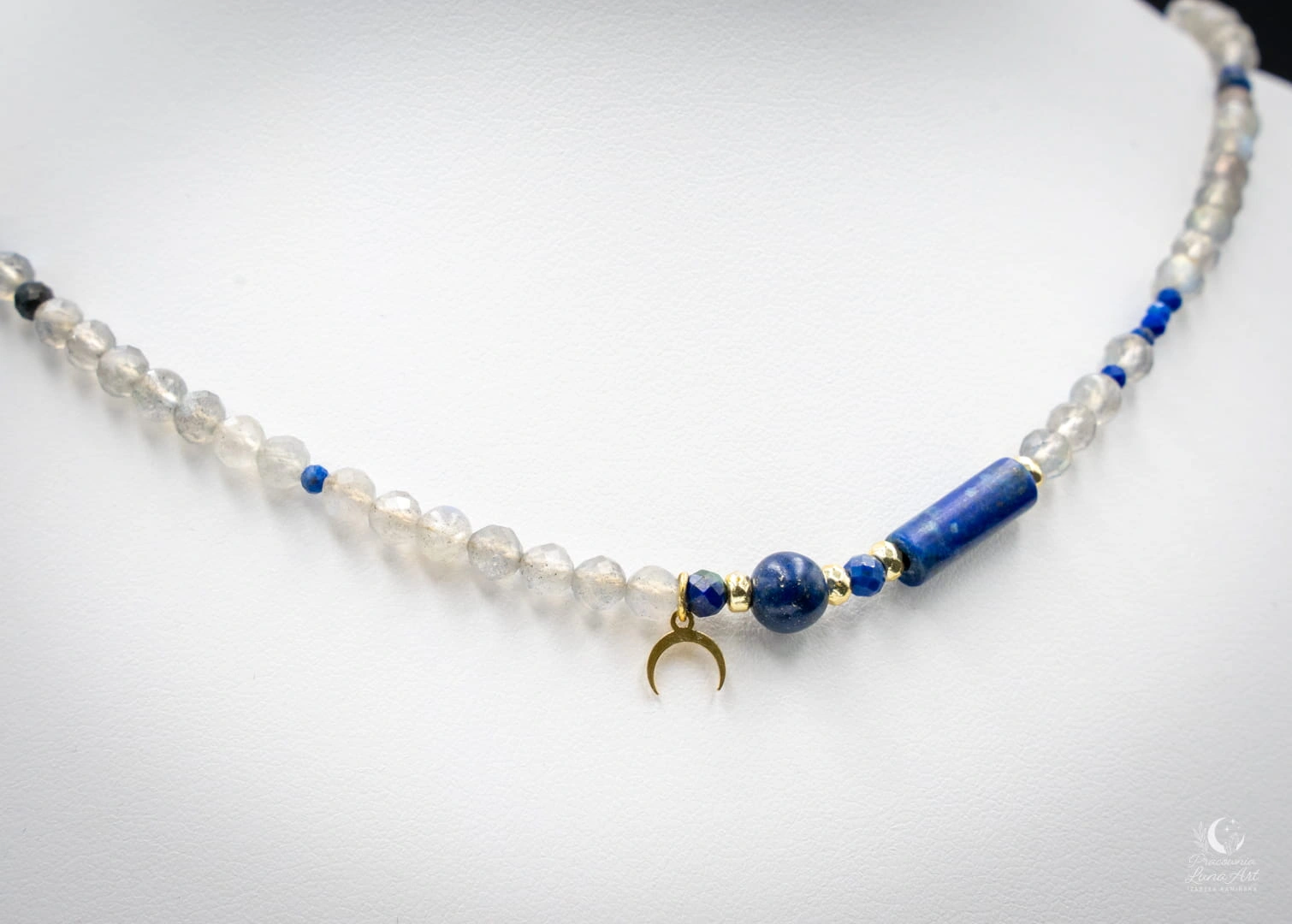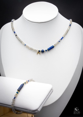 Subtelny, ręcznie wykonany zestaw biżuterii z kamieni o średnicy 4 mm, utrzymany w głębokich odcieniach granatu i migoczących refleksach labradorytu. To eleganckie połączenie światła i tajemnicy – inspirowane nocnym niebem oraz energią księżyca. Centralnym elementem naszyjnika jest zawieszka w kształcie Rogu Obfitości, symbolizująca intuicję, cykliczność, rozwój oraz przyciąganie dobrobytu.