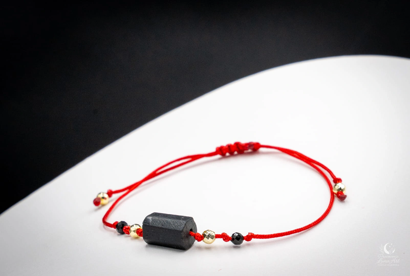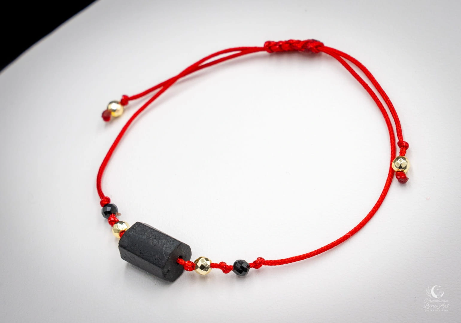 Po bokach znajdują się fasetowane koraliki z hematytu w kolorze czerni oraz złote elementy, które dodają całości elegancji i subtelnego blasku. Bransoletka posiada regulowane wiązanie makramowe, dzięki czemu łatwo dopasowuje się do nadgarstka. Intensywnie czerwony sznurek tworzy wyrazisty kontrast z czernią kamieni i złotymi akcentami, nadając całości nowoczesny, ale jednocześnie symboliczny charakter.